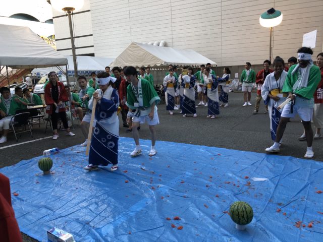 用意したスイカはなんと12個!しかも国産の特大のもの!チームごとに分かれ、スイカの割れ方で得点を競います。目隠しをしたままフラフラとスイカに近づくと大歓声がわき起こり、木の棒を振り下ろす瞬間、ボルテージは最高潮に!