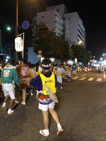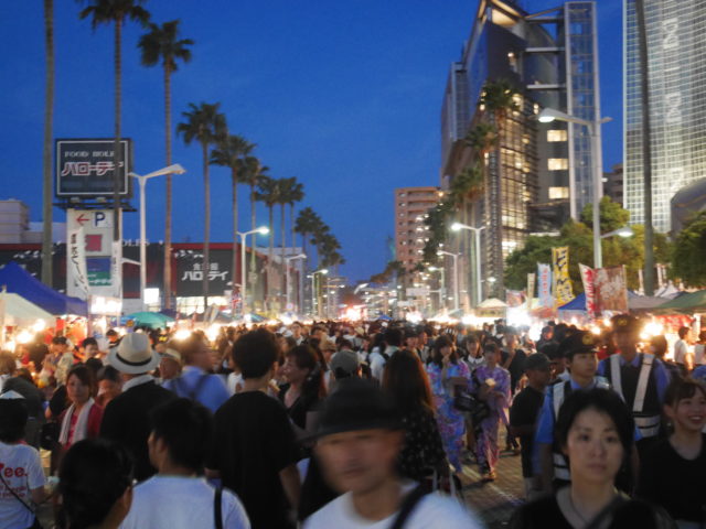 馬関まつりの特徴の一つがその規模の大きさ。下関の市街地全体が会場となるので、端から端まではおよそ3キロ。徒歩だとおよそ40分もかかります。