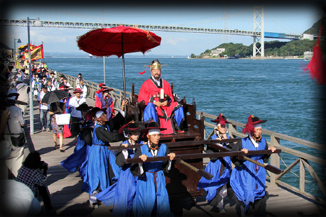 現在の韓国・ソウルを出発し、海路で日本を目指した朝鮮通信使の一行が日本本土へ最初に寄港した場所が下関だったことから、2002年のサッカーW杯を機にこの馬関まつりで朝鮮通信使の行列を再現することとなりました。以来、民間における文化交流の機会として発展を続け、国際関係を築く上でも重要な役割を果たしています。