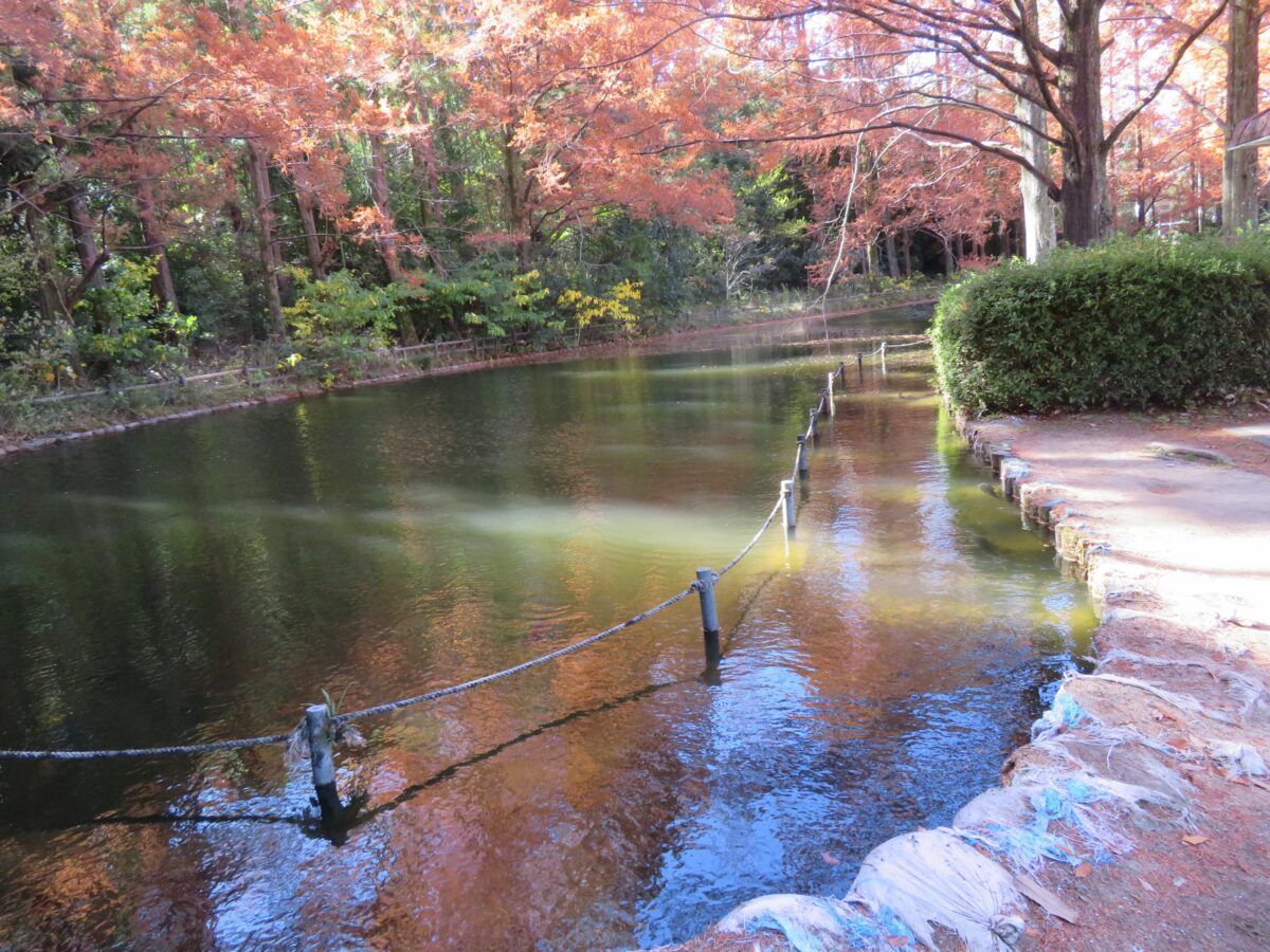 「もみの池」の周辺からは園路に向かって紅葉が近づいてきます。