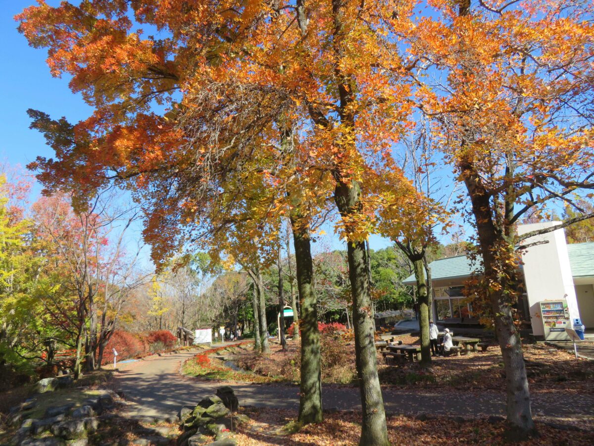 園路沿いに建つ「自然観察学習館」は、すっぽりと紅葉で覆われます。