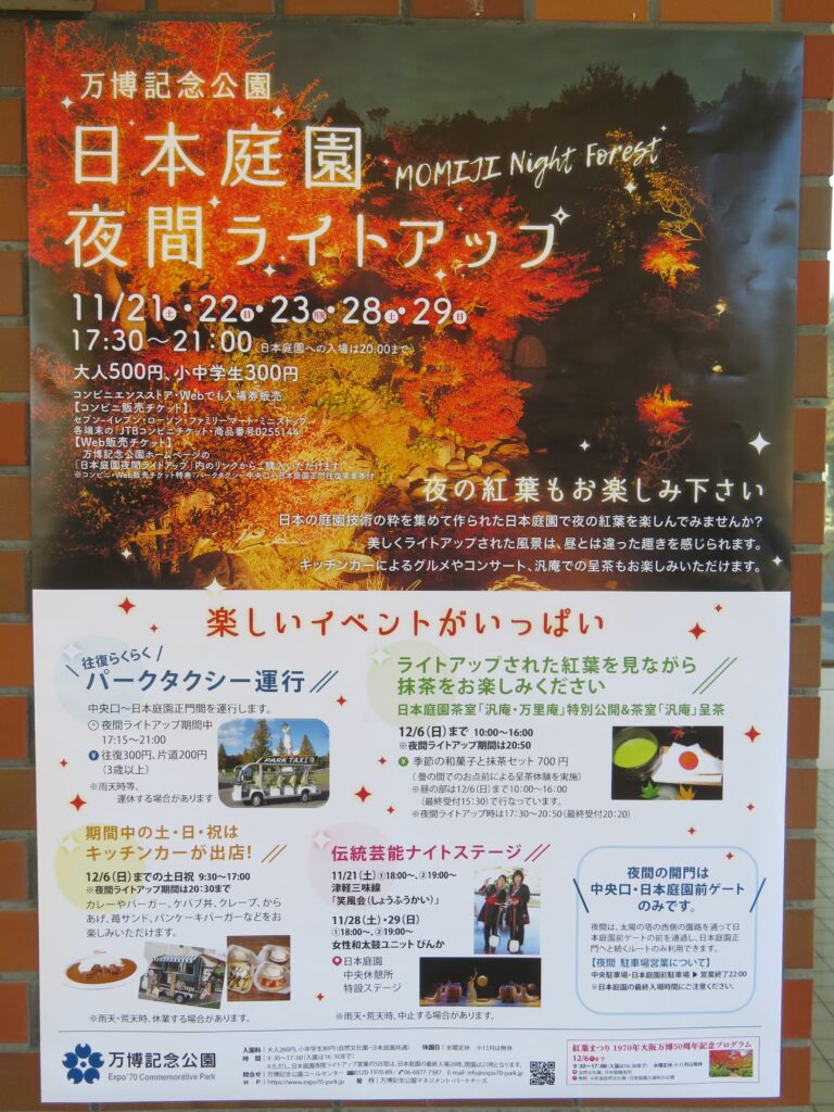 「万博記念公園紅葉まつり」の期間中の中でも最も見頃となる11月下旬の土日祝日には、日本庭園ライトアップや、津軽三味線や和太鼓などの伝統芸能ナイトステージのイベントが企画されています。