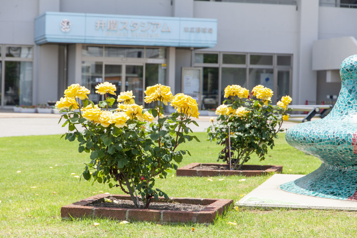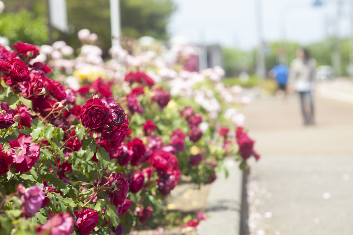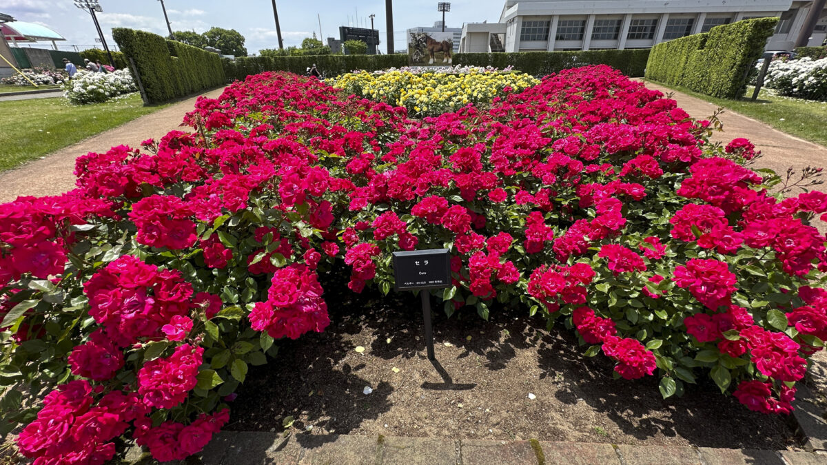 運動公園の道路側に常設されているバラ園なのですが、中心にはギュッとバラを見られる場所がありますが、運動公園に来場された方々をおもてなしするように、バラ園から少し離れた場所でも美しいバラが楽しめます。