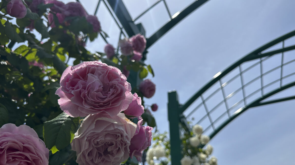 西洋風あずま屋「ガゼボ」で休憩しつつ見られるバラ