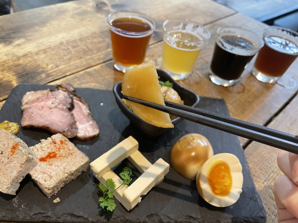 この日は、神奈川県清川村のめぐみポークを使用した自家製ベーコンと、同じくめぐみポークのパテ・ド・カンパーニュ。横須賀産のカブの煮浸し、黒ビールに漬け込んだクリームチーズ、横須賀市にある安田養鶏場の卵を使用した燻製です。地元食材を使ったおつまみは、どれも美味しく、ビールとの相性もバッチリ!ビールがどんどん進んでしまいます!地元の食材のおいしさを知り、食材を通して地元がさらに好きになってしまうお店でした!