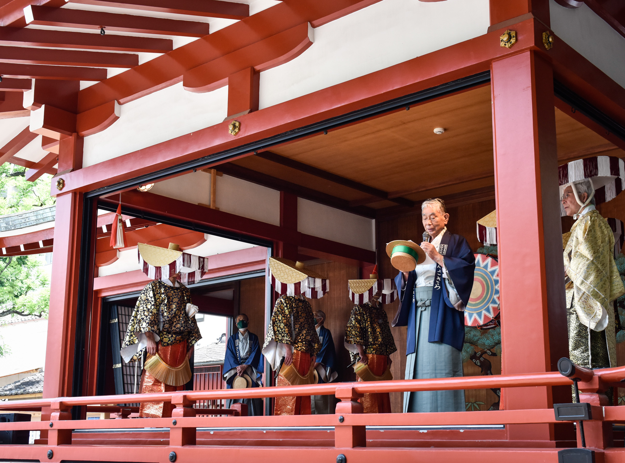 この神楽殿では、司会の方がまず浅草神社やびんざさら舞に関する歴史についての解説を行ったのち、舞い手によるささら舞が披露された。ささら舞は、種蒔、肩揃、鶫間口、蹴合という4つの演目からなり、それぞれ以下ような意味が込められているそうだ。