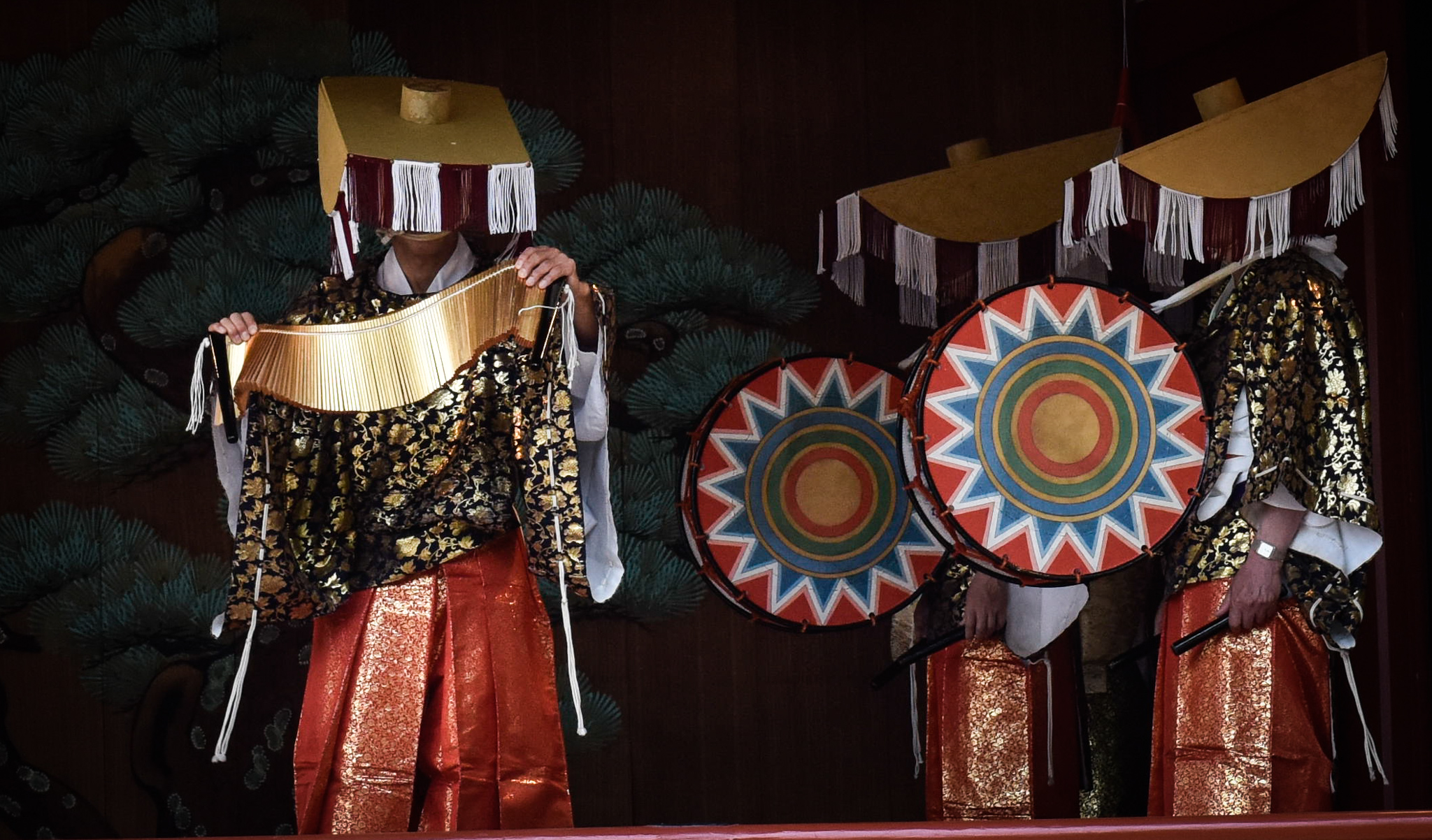 拝殿から出てきたびんざさら舞の舞い手たちは、11時半過ぎに神楽殿へと向かった。きらびやかな装束を間近で見ることができた。