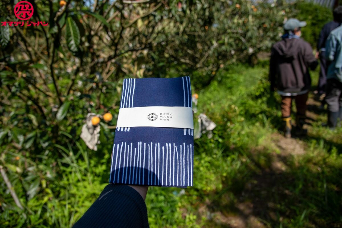 「手ぬぐいがびわ畑の通行手形です」と配られたのは、筒井時正玩具花火製造所の線香花火をモチーフにした素敵な手ぬぐいです。