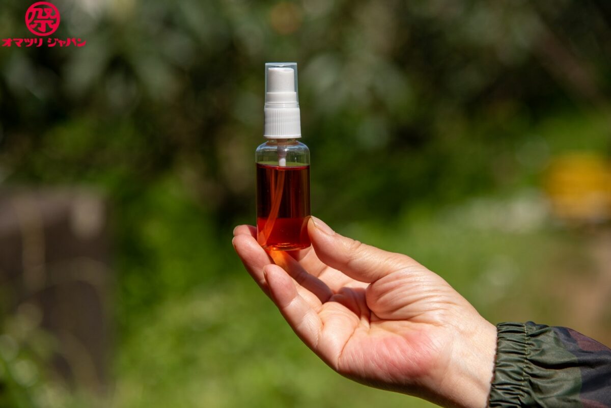 メンバーさん手作り、この畑で採れた「びわの葉っぱ」で作られた虫よけスプレー