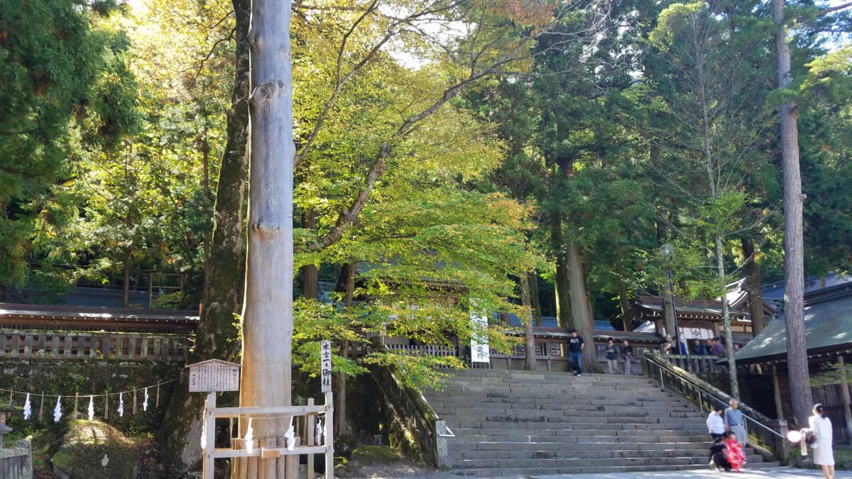 諏訪大社上社本宮 一之御柱と塀重門。 写真AC:acsunifu23さん