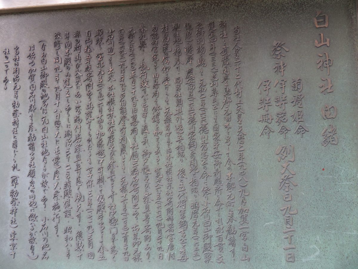 白山神社は948年に、加賀の白山比咩神社からの勧請を受けて創建されたと伝わります。江戸時代には第5代将軍徳川綱吉や、その生母桂昌院の手厚い保護を受けました。明治時代には祖国を離れ日本に暮らした孫文が、辛亥革命の成功を心に誓いながら腰をかけた座石が境内に残されています。