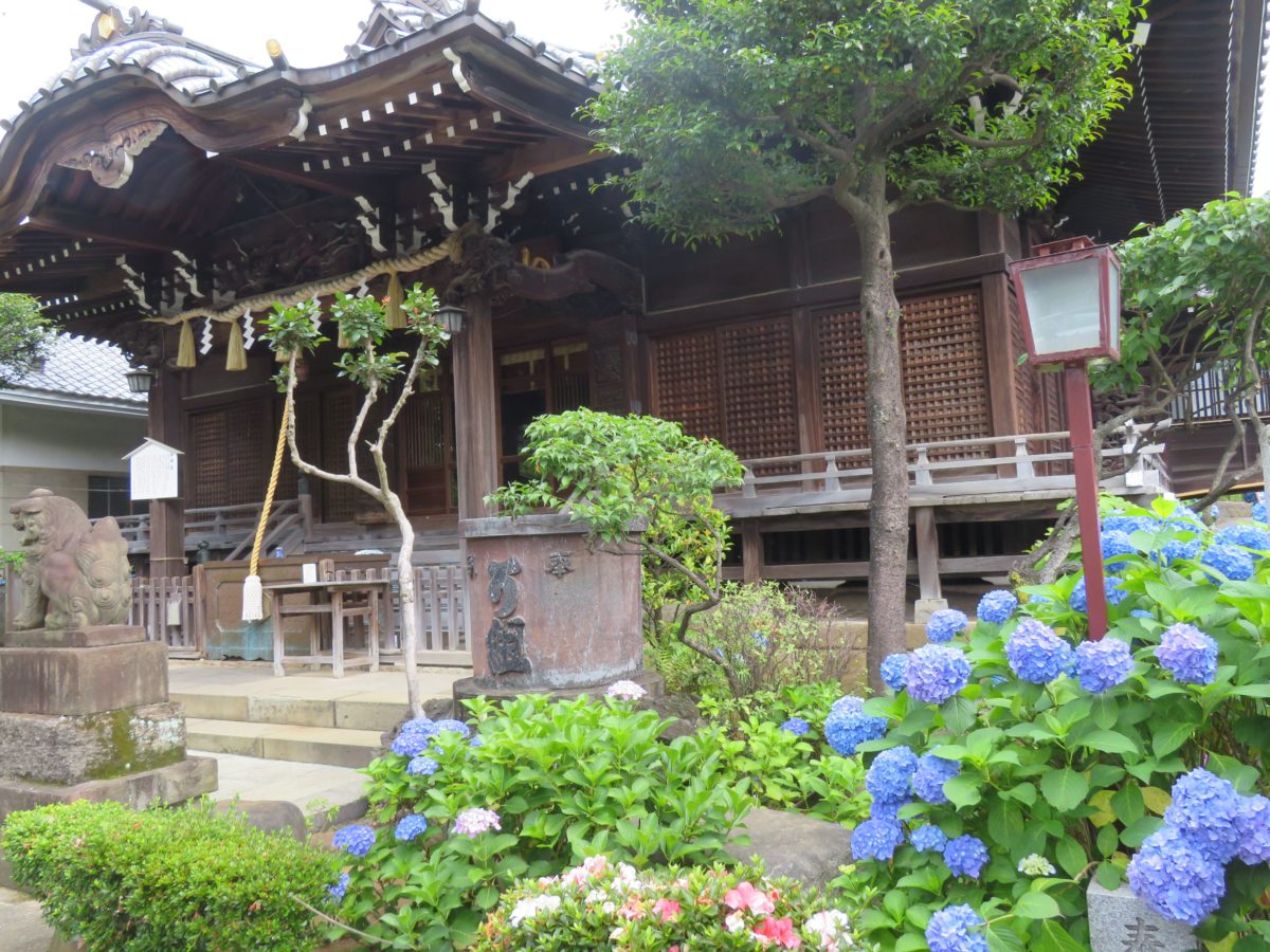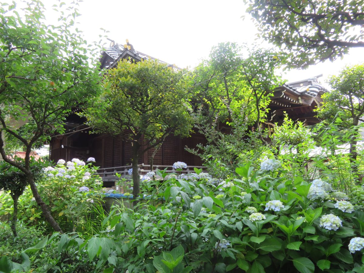 あじさいの花に包まれる白山神社の本殿
