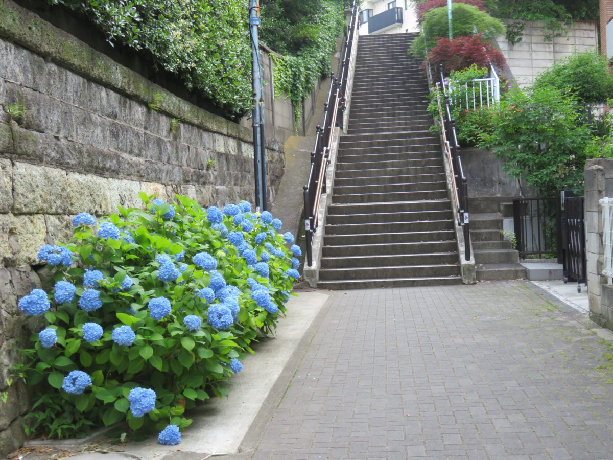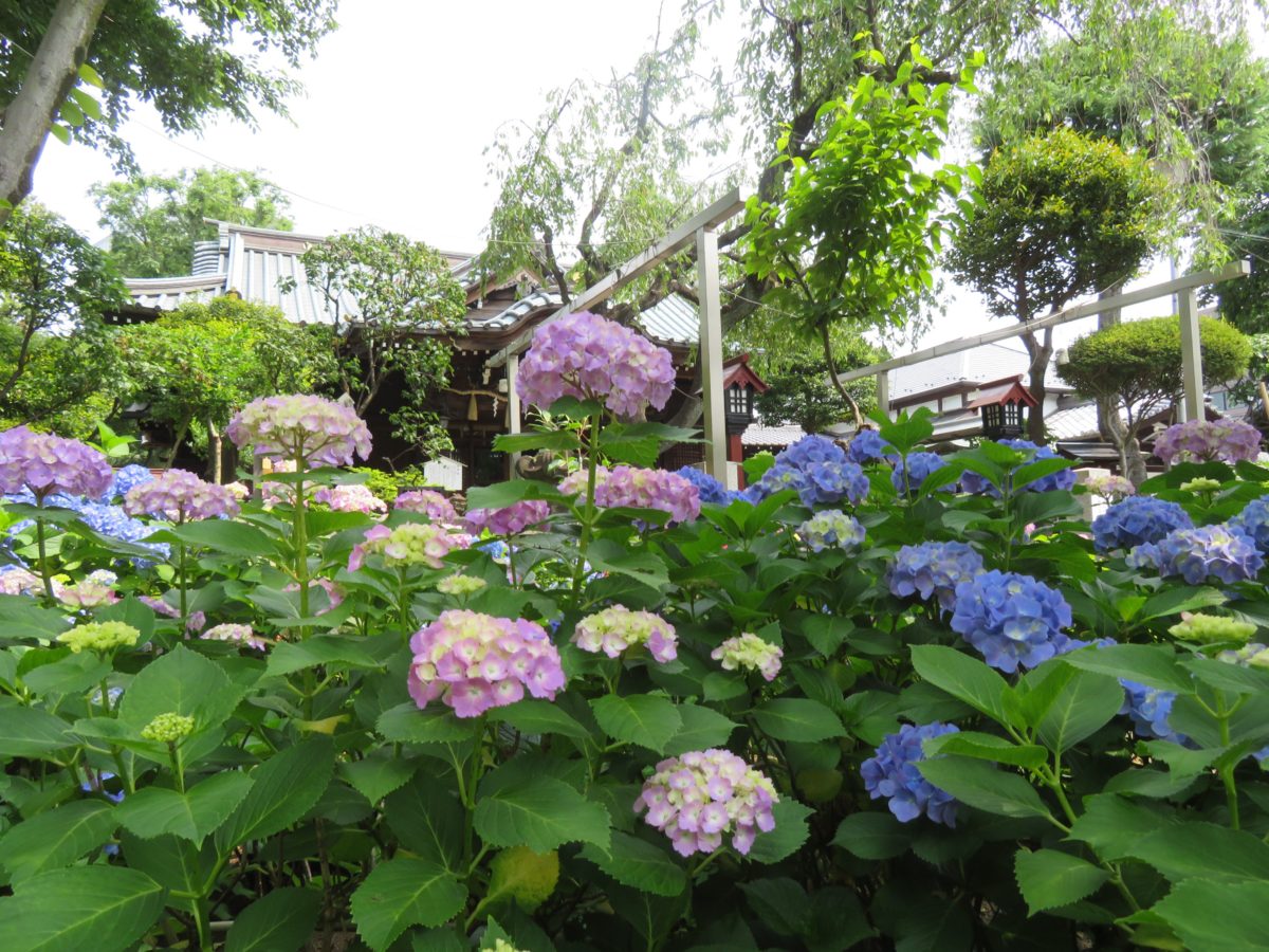 神社の南の坂下で咲くあじさいの花