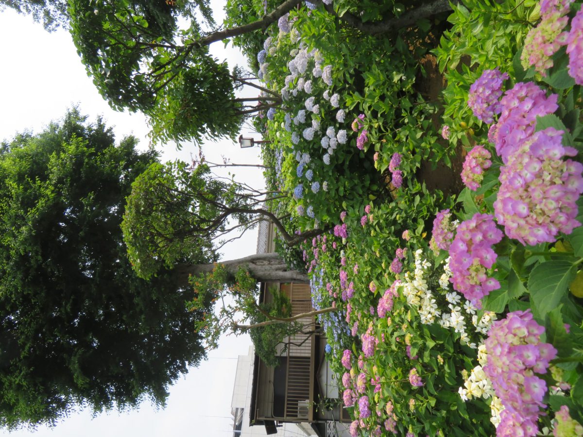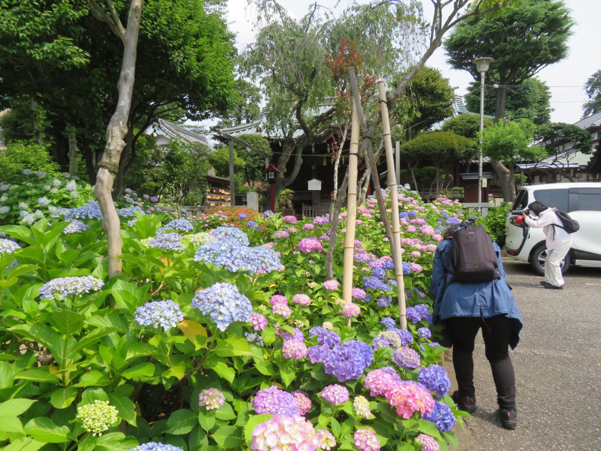 神社の境内から白山公園に溢れ出すあじさいの花