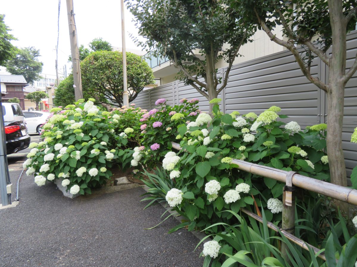 駐車場や神社の南の坂下にもあじさいの花が咲き、敷地内ではあじさいの姿が消えることはありません。