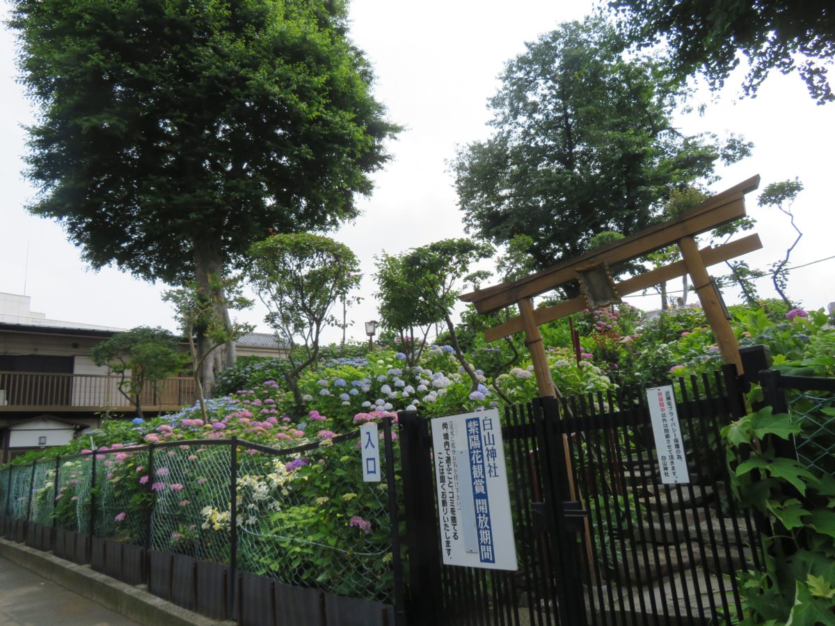 東京の文京区白山の地名はエリア内に白山神社が建造されたことによると伝わります。都営地下鉄三田線「白山」駅のA3出口の北に接する道を約3分歩いた突き当たりに鳥居を構えています。神社の境内から白山公園の敷地内を埋め尽くすように、あじさいが植栽され例年6月上旬から中旬には季節の彩りに包まれます。2021年の「文京あじさいまつり」は新型コロナウイルス感染防止のため中止となりました。例年のようにイベントを楽しむことはできませんが、6月中旬には旬を迎えるあじさいを鑑賞することができます。(記事公開時の情報です。必ず最新の公式情報をご確認ください。)
