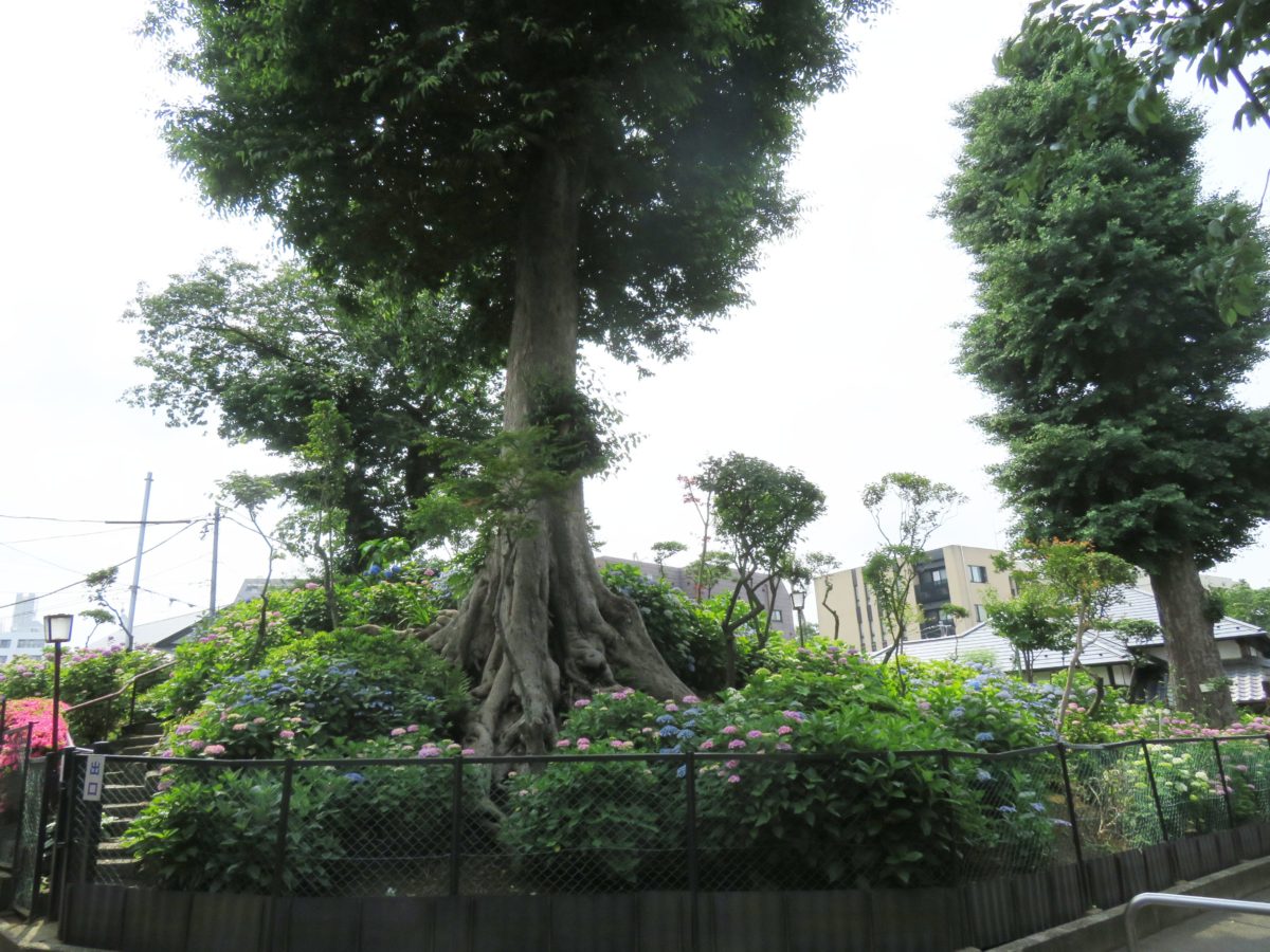 そして、「文京あじさいまつり」の会場の中で最大の見どころは、白山公園の東に接する富士塚です。小高い丘の中央に文京区の保護樹木に指定されたイチョウの巨木が育ち、その周囲をあじさいの花が隙間なく覆い尽くすのです。立体的、重層的に重なり合うあじさいの花に圧倒されることでしょう。
