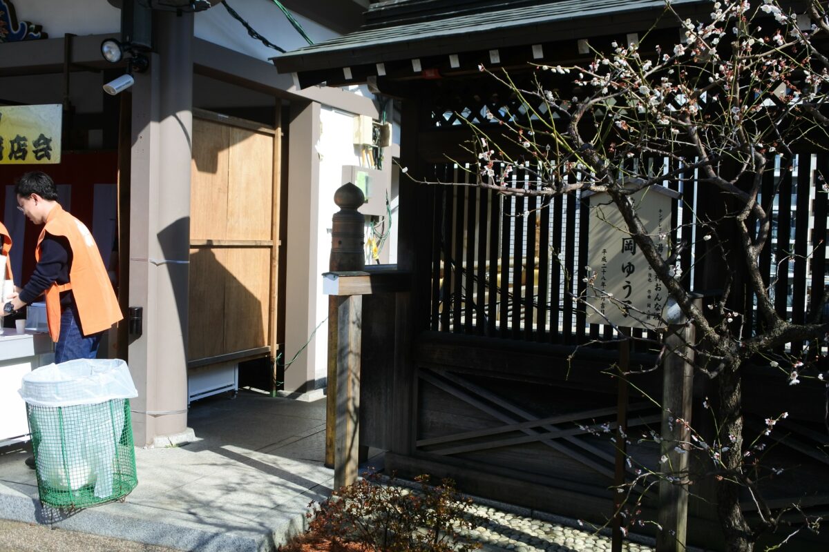 境内北側の夫婦坂を上がったところにもお店が並び、ここでは白梅商店会のお茶のふるまいも。