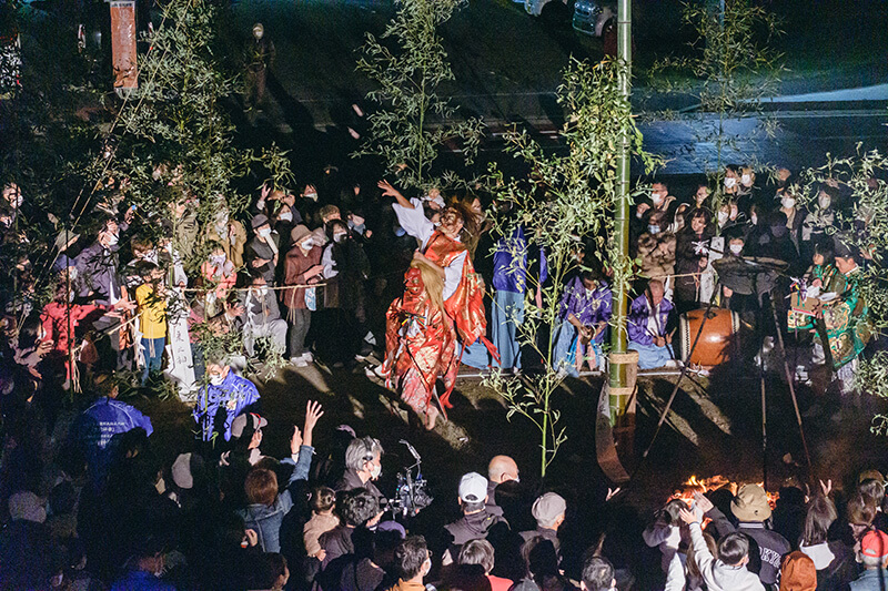 子ども神楽の6演目が終わると外はすっかり陽が落ちていた。会場外の広場に人だかりができている。その中心には10mを超す湯鉾(竹)が建てられ、その下には火が焚かれ湯釜が設えられる。豊前神楽の特徴的な演目のひとつ「湯立て」の始まりだ。 湯立ては、修験道の影響を色濃く残す豊前神楽を象徴する最も勇壮的な演目である。最大の見せ場は、10mを超す湯鉾を一気に登りつめ、大幡を切り落とすシーンである。下界の混沌を置き去りに、人知れず積み重ねてきたものと共に、命綱もつけずに闇夜を一気に駈け登る姿は、潔く美しい。天界で異形の者に託した己の身体を変幻自在に操る姿は、華麗でいて力強い。また最後に行われる火渡りも圧巻である。燃えた炭の上を素足で歩く。いずれも常人を超えた異能の技である。固唾を飲んで見守る観衆からこんな声が聞かれた。「普通の人なんよねぇ?」。どう答えればよいのだろう。神楽舞は、面を外し、衣装を解けば、観衆と同じ地域で暮らす普通の人々だ。そんな普通の人が、一度、衣装を身に纏い、面をつければ常人を超えたパフォーマンスを繰り広げる。日々の鍛練、精進の賜物か。興奮冷めやらぬ内に1日目は幕を閉じた。