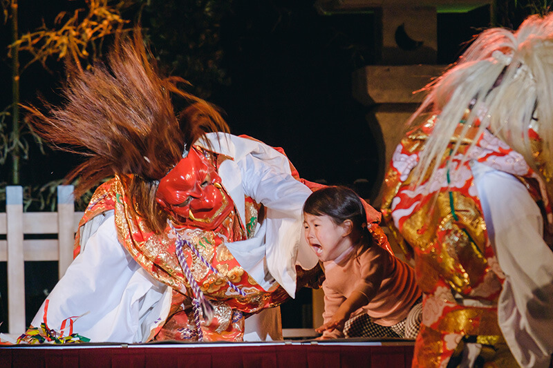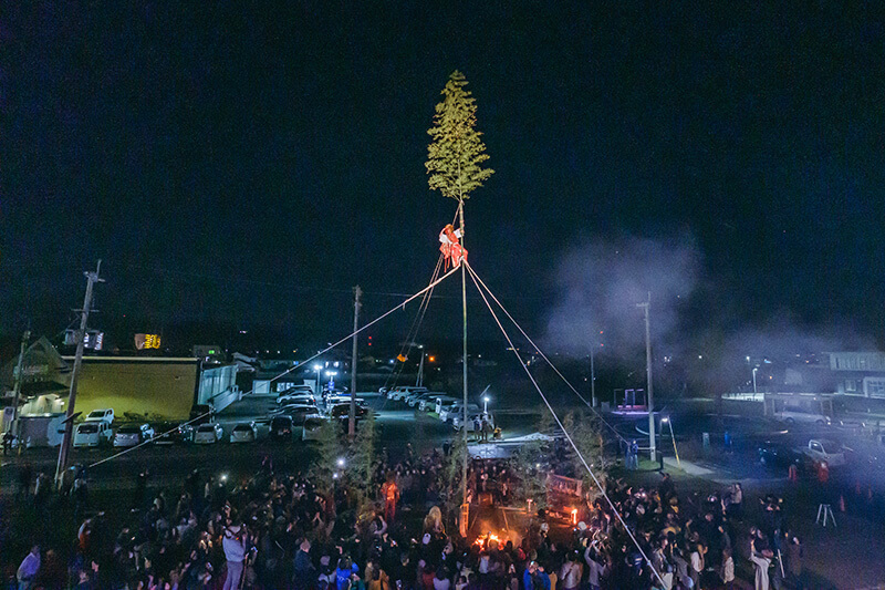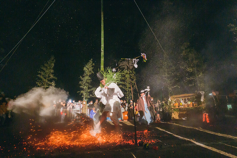 子ども神楽の6演目が終わると外はすっかり陽が落ちていた。会場外の広場に人だかりができている。その中心には10mを超す湯鉾(竹)が建てられ、その下には火が焚かれ湯釜が設えられる。豊前神楽の特徴的な演目のひとつ「湯立て」の始まりだ。 湯立ては、修験道の影響を色濃く残す豊前神楽を象徴する最も勇壮的な演目である。最大の見せ場は、10mを超す湯鉾を一気に登りつめ、大幡を切り落とすシーンである。下界の混沌を置き去りに、人知れず積み重ねてきたものと共に、命綱もつけずに闇夜を一気に駈け登る姿は、潔く美しい。天界で異形の者に託した己の身体を変幻自在に操る姿は、華麗でいて力強い。また最後に行われる火渡りも圧巻である。燃えた炭の上を素足で歩く。いずれも常人を超えた異能の技である。固唾を飲んで見守る観衆からこんな声が聞かれた。「普通の人なんよねぇ?」。どう答えればよいのだろう。神楽舞は、面を外し、衣装を解けば、観衆と同じ地域で暮らす普通の人々だ。そんな普通の人が、一度、衣装を身に纏い、面をつければ常人を超えたパフォーマンスを繰り広げる。日々の鍛練、精進の賜物か。興奮冷めやらぬ内に1日目は幕を閉じた。