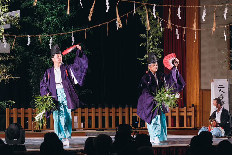 2日目。開場前、舞台では大禮祝詞が行われた。厳かな雰囲気。神楽は神事であることを改めて認識する。開場。昨日に続き、この日を待ち焦がれた人々が席を埋めていく。最前列に陣取った女性は86歳。話を聞いてみた。「コロナの間、何も面白いことがなかった。楽しみにしてました。子どもの頃から村祭りで太鼓とか笛の音を聴くと心がウキウキしてた」。筋金入りだ。こんな人たちに地域の祭りは支えられている。