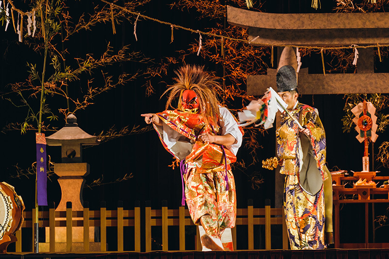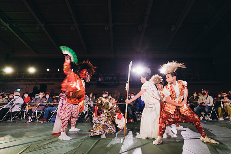 豊前には6つの神楽団体があり、長きにわたり里神楽の伝承保存に取り組んできた。その1つに「子ども神楽」がある。6団体は地域の子ども達に普段から神楽を教え、伝承に努めている。そんな6団体の子ども神楽の競演で幕が上がった。鬼の面を被り、様々な衣装を纏った小中学生が、日頃の練習の成果を如何なく発揮している。コロナ禍で練習時間の制限を余儀なくされ、しかも披露する場所や機会をなくした。辛く、不安の日々だったことだろう。そんな想いを払拭するような華麗で迫力のある舞の数々。そこには控室であどけない表情や緊張の面持ちでいた子どもの姿はない。鬼となり、幣方(ひいかた)となり、元気いっぱいに舞う姿は頼もしい。そんな継承者を指導者でもある神楽舞が厳しくもあたたかい目で見守る姿が印象的だった。