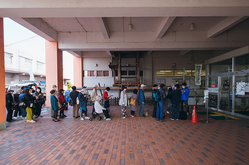 子ども神楽1日目。15時開始にもかかわらず、「9時前から並んでいる」と言う豊前市外からかけつけた神楽ファンの行列があった。豊前神楽への関心の高さがうかがえる。