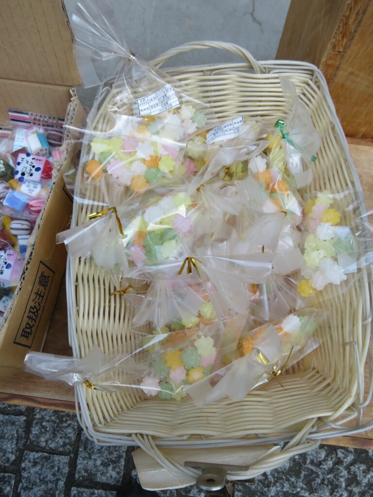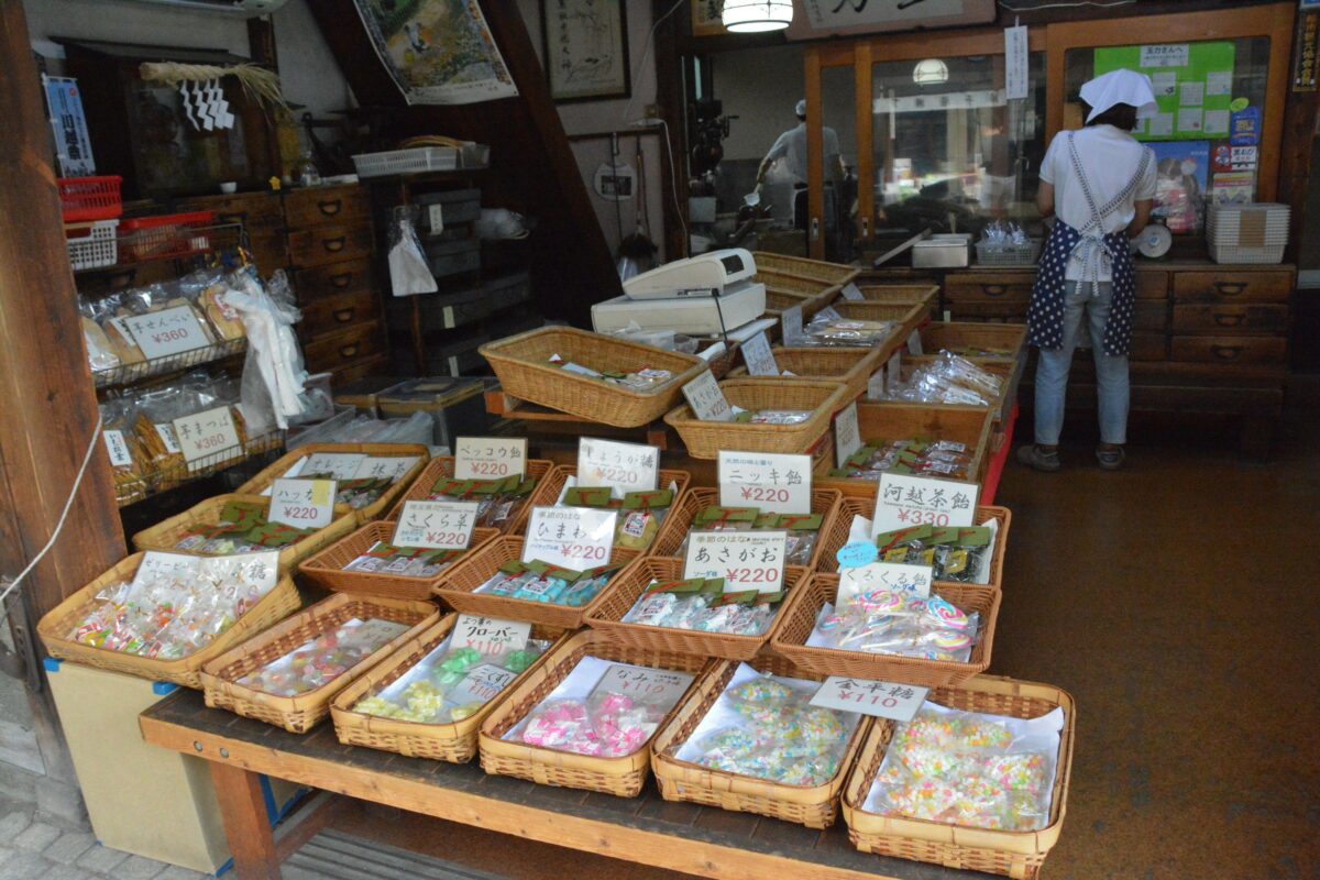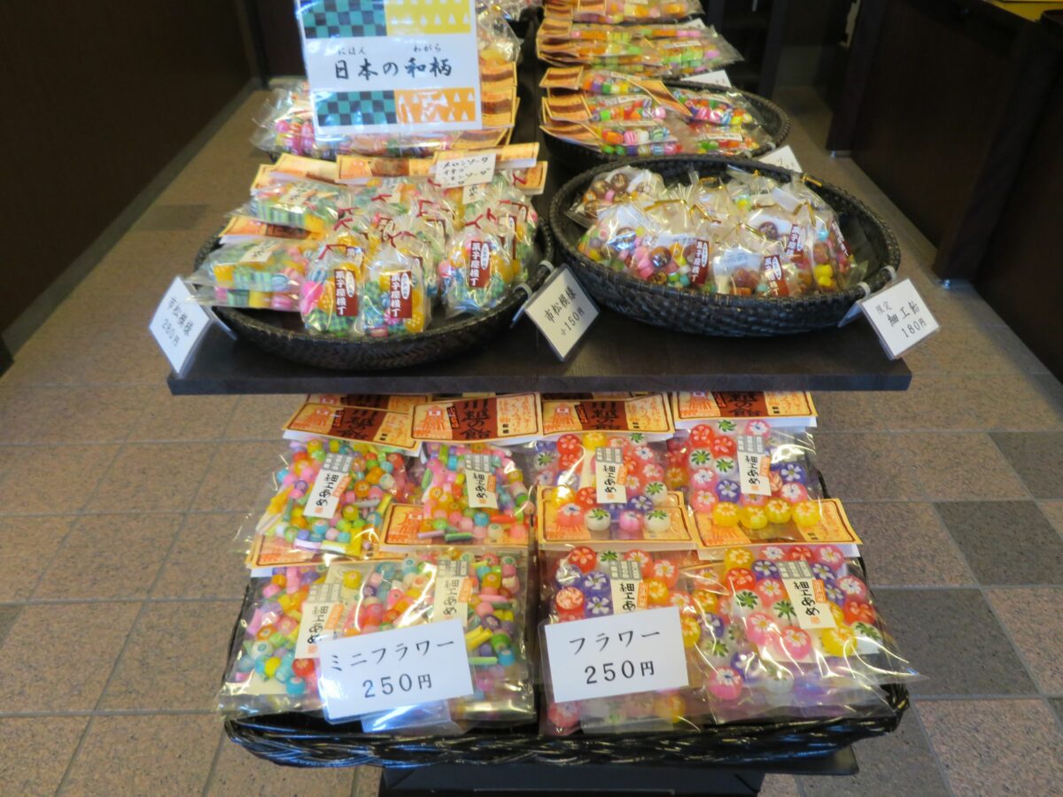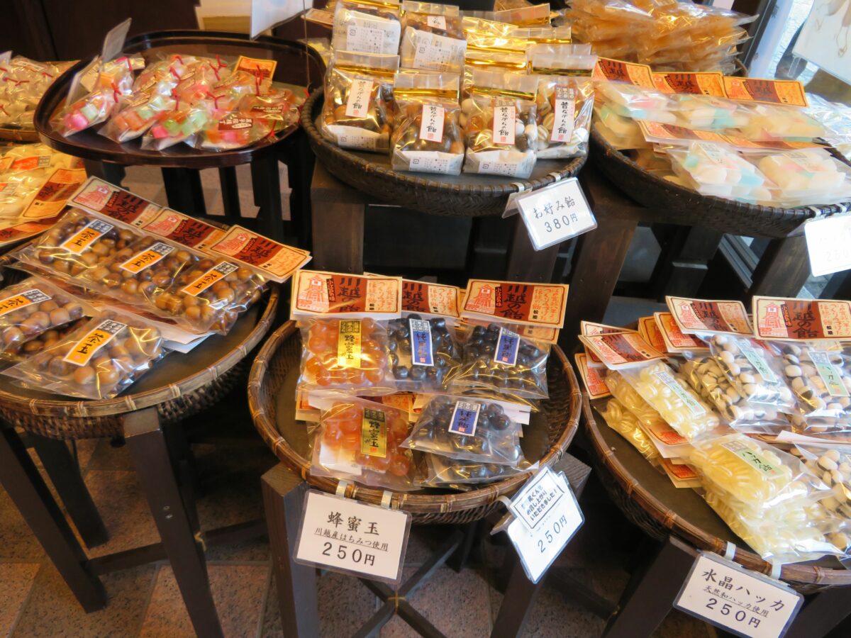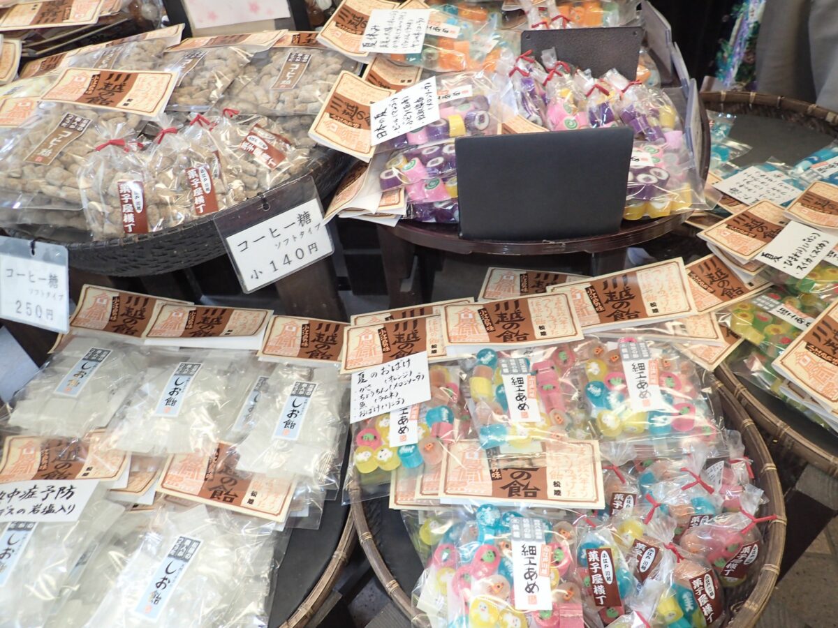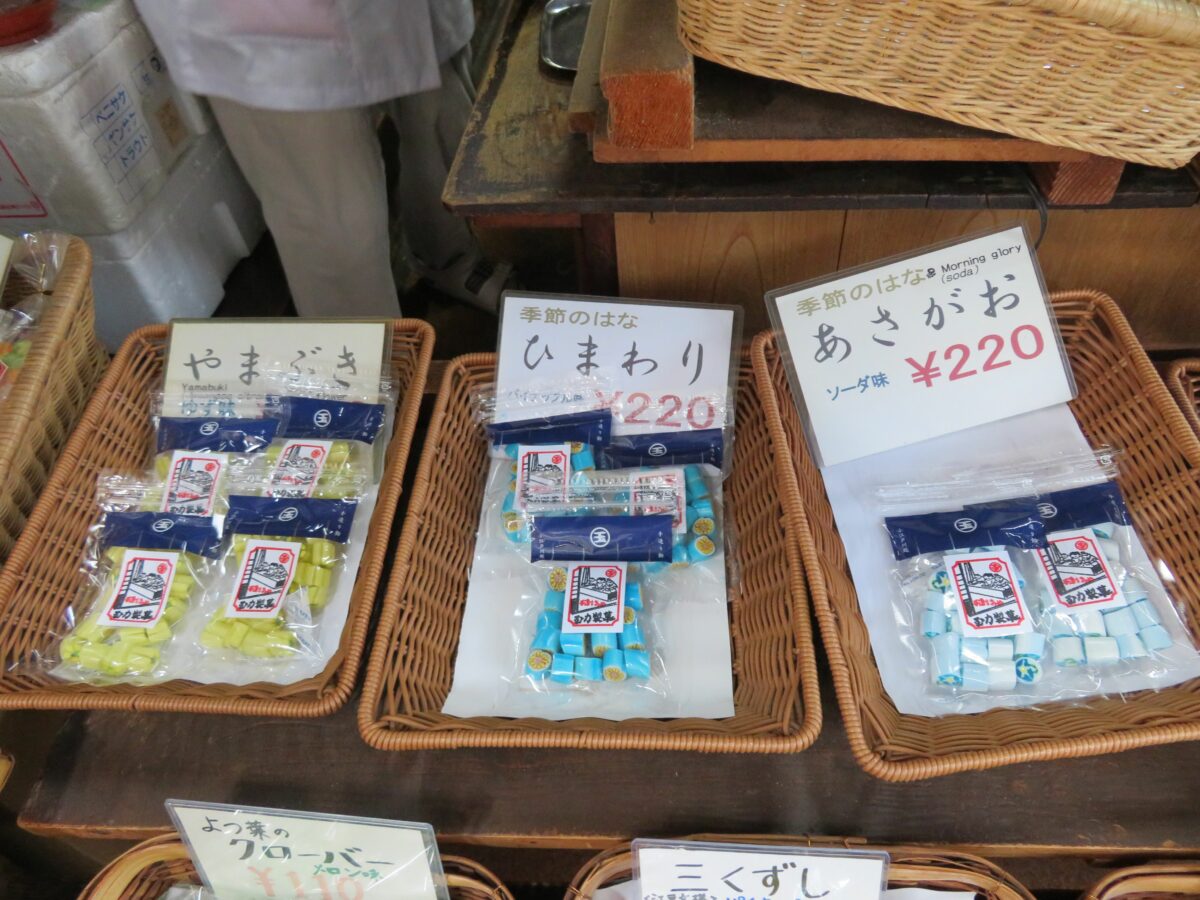 店先には鮮やかな彩りの季節の花があしらわれた組飴をはじめ、ベッコウ、ニッキ、ゴマ飴などバラエティー豊かな飴が、笊に詰められて並んでいます。