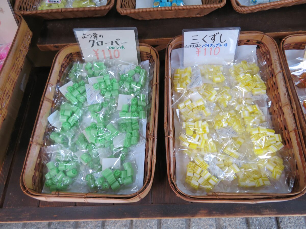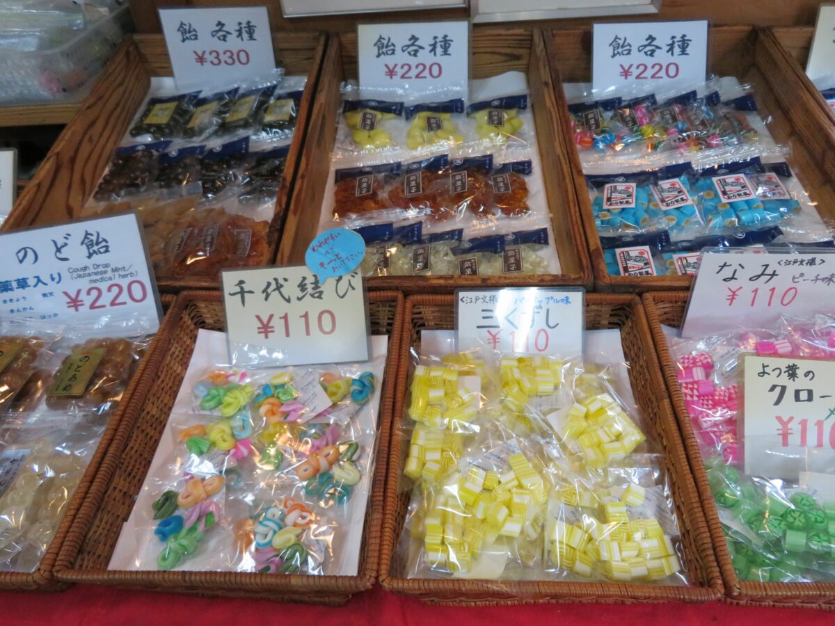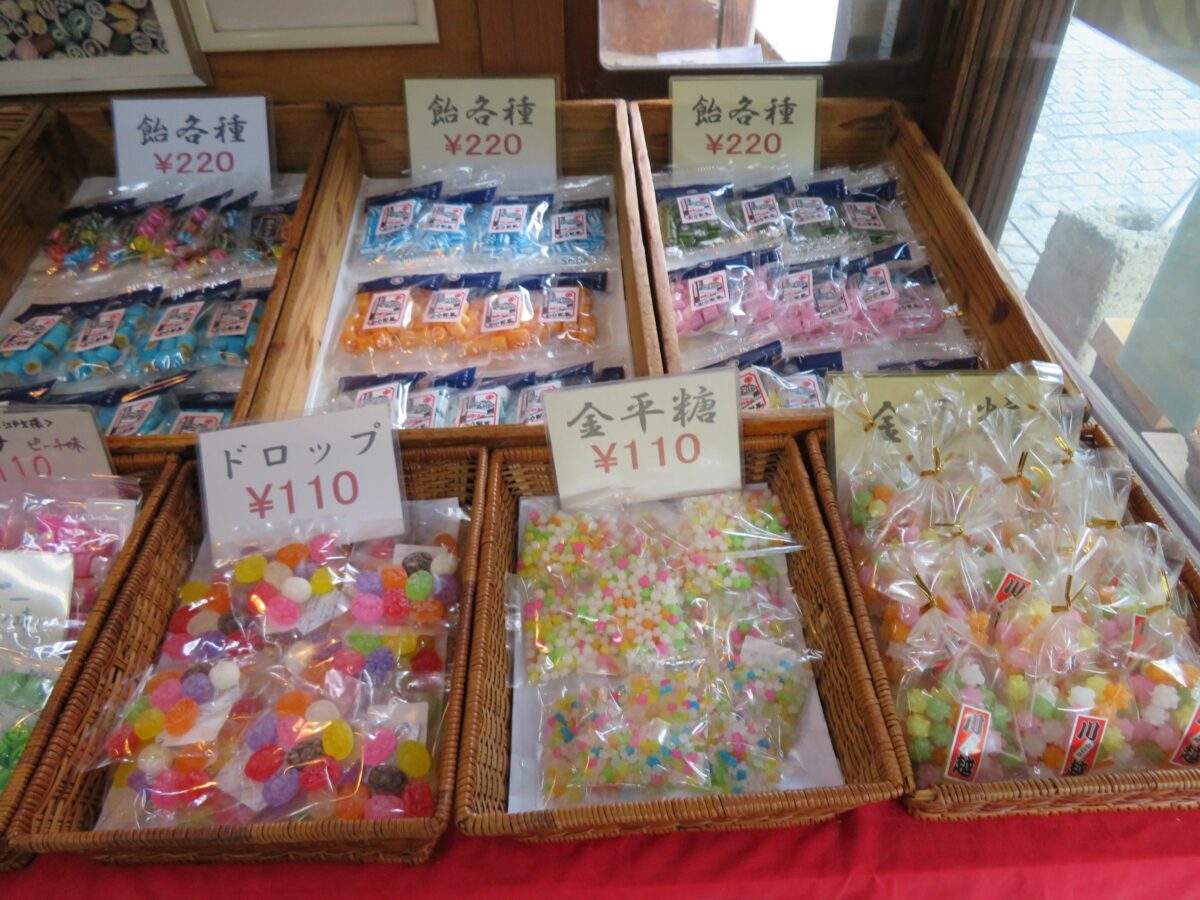 「あめ細工」店の正面の「松陸製菓」でもユニークな飴を販売しています。松陸製菓は江戸時代の寛政年間1796年に創業した老舗和菓子店で、「味は人なり」の言葉が代々受け継がれ、8代にわたって伝統の製法を守っています。添加物は一切使わず自然な素材で和菓子を作り続け、15種類前後の自家製飴の他に、ふ菓子や芋菓子も店先に並んでいます。