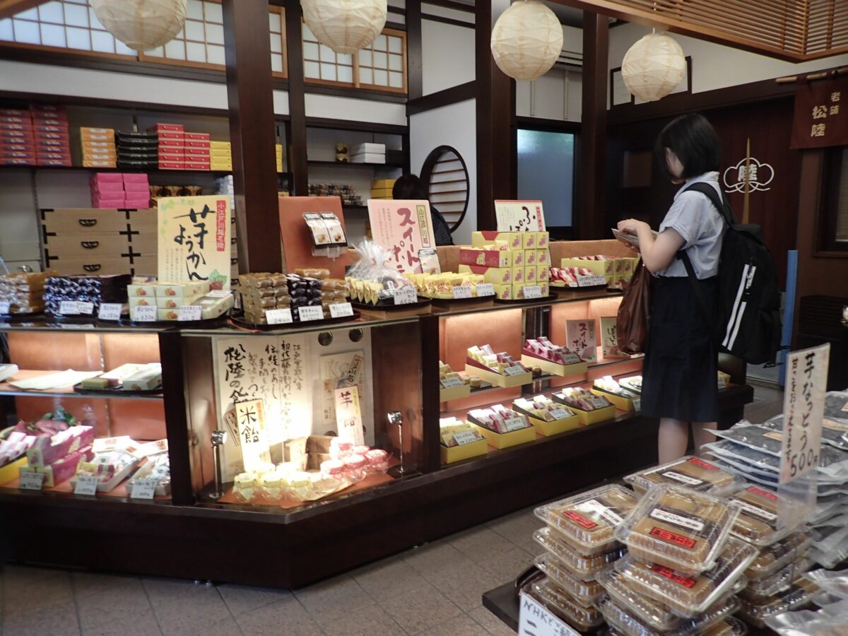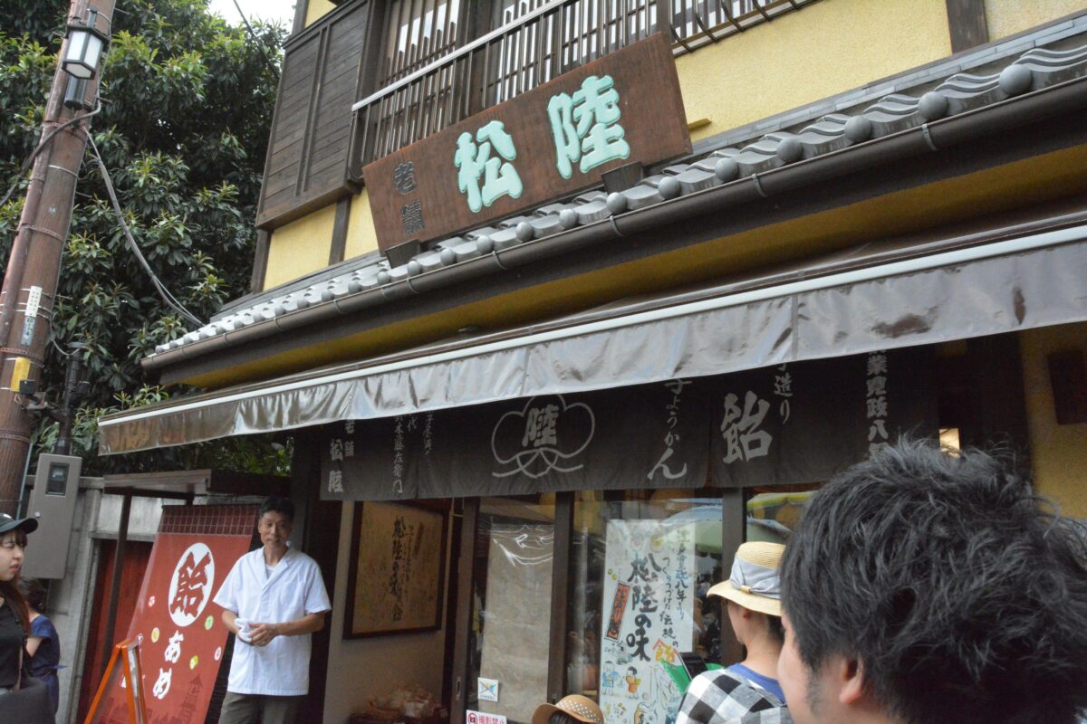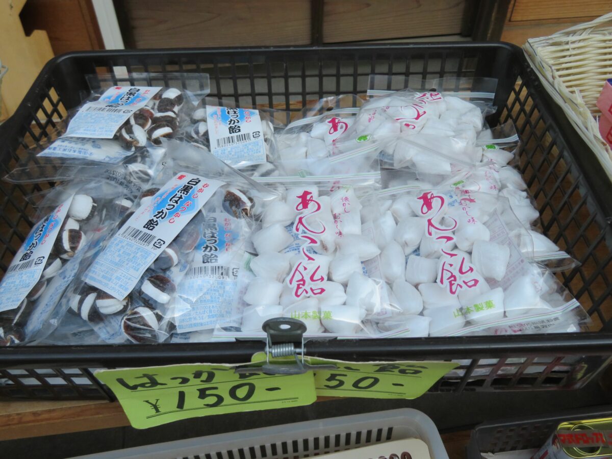 「あめ細工」店の正面の「松陸製菓」でもユニークな飴を販売しています。松陸製菓は江戸時代の寛政年間1796年に創業した老舗和菓子店で、「味は人なり」の言葉が代々受け継がれ、8代にわたって伝統の製法を守っています。添加物は一切使わず自然な素材で和菓子を作り続け、15種類前後の自家製飴の他に、ふ菓子や芋菓子も店先に並んでいます。
