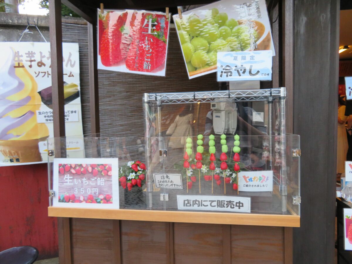 「松陸製菓」の店先に並ぶ手作り生いちご飴