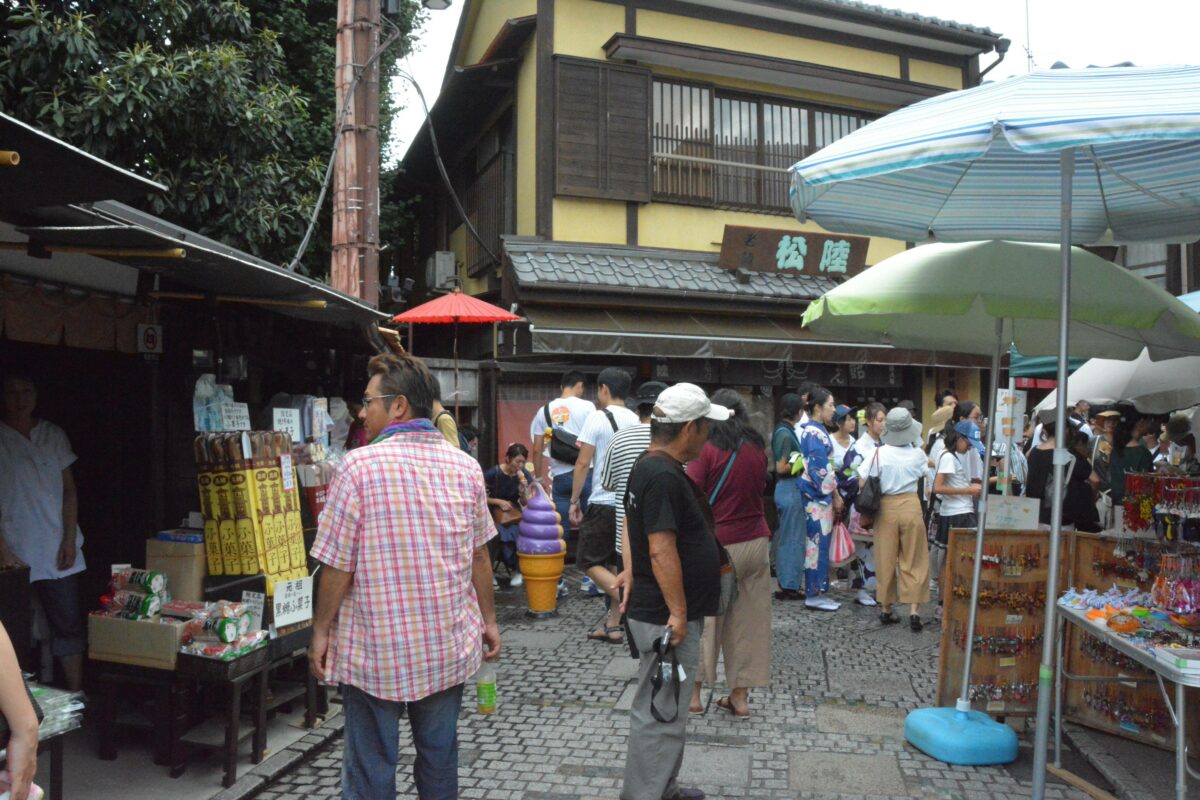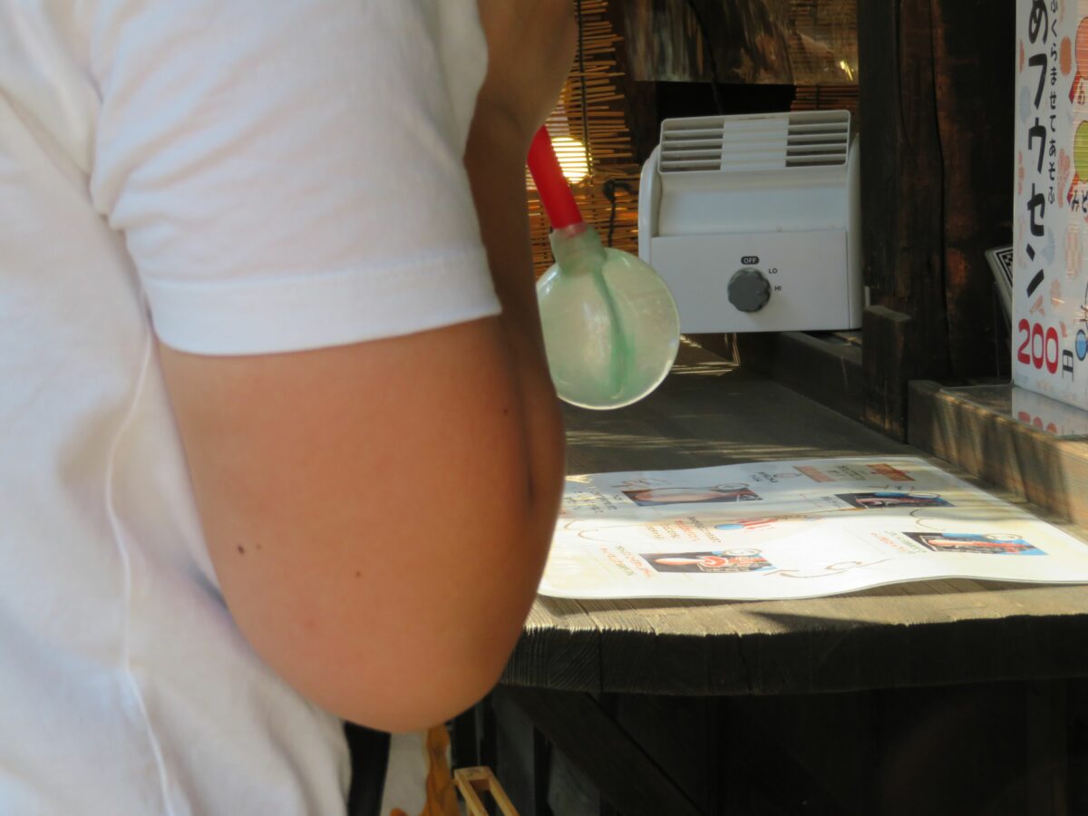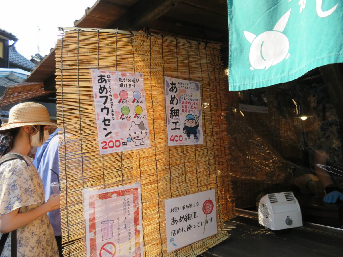 「玉力製菓」の西に漬物店の「三代目彩香」を挟んで隣り合うのは「あめ細工」の店です。熱くて柔らかい飴にストローで空気を吹き込んで膨らませます。球状の風船のような形にするには熟練の技が必要ですが、中には初体験で大きな風船飴を完成させる人もいるようです。