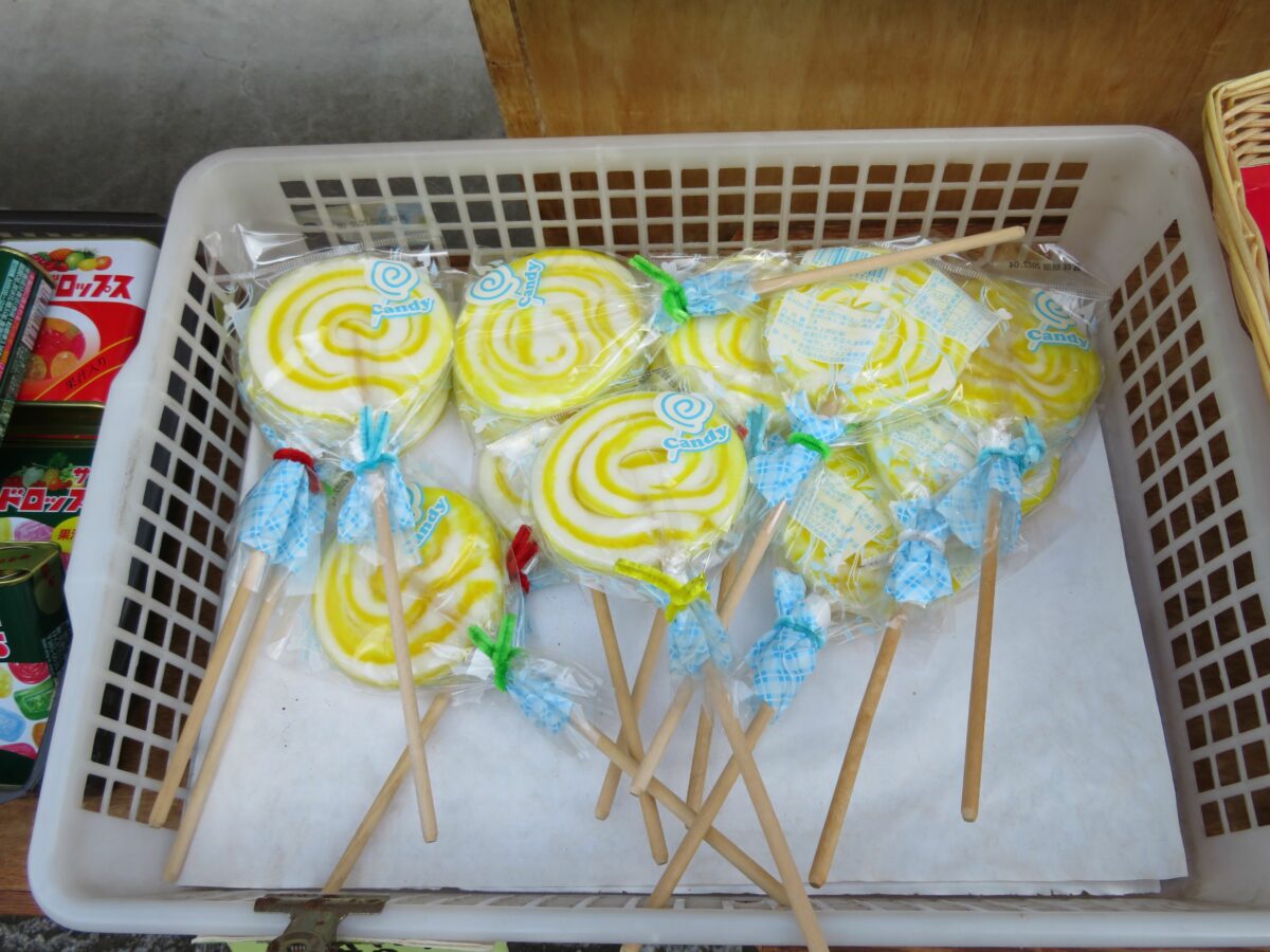 「玉力製菓」の店先に並ぶ棒ベッコウやくるくる飴