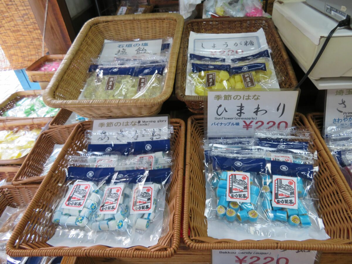 「玉力製菓」の店先に並ぶ季節の花があしらわれた手作り飴やしょうが飴