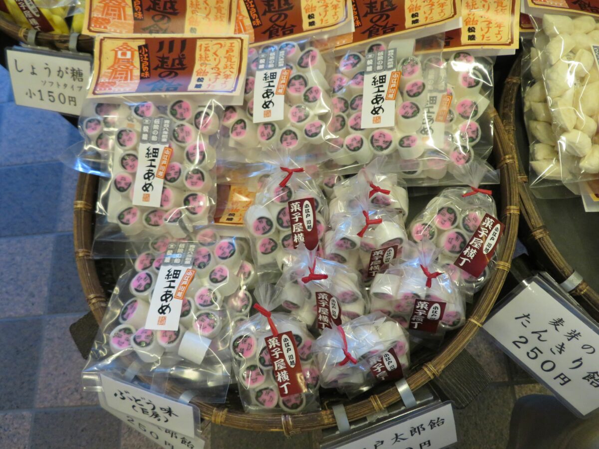 菓子屋横丁では老舗の飴店がレトロな存在感を放っていますが、各種の駄菓子を販売する店舗でも、飴の品揃えは豊富です。「小江戸茶屋」に並ぶ飴の種類は老舗店に引けを取らないでしょう。
