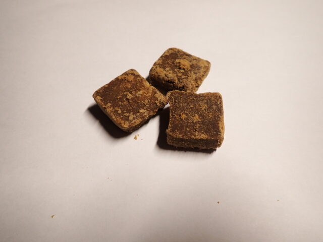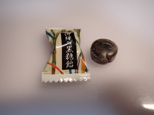 砂糖の塊ですが、甘過ぎず、ぽりぽり食べてしまいます。沖縄では黒糖が飴みたいな扱いで、簡単なおやつ代わりになっています。スーパーに何種類も売っていて、不動産屋のカウンターにも、果物系の飴と一緒にフリーで置いてあり、比較的ポピュラーな食べ物です。