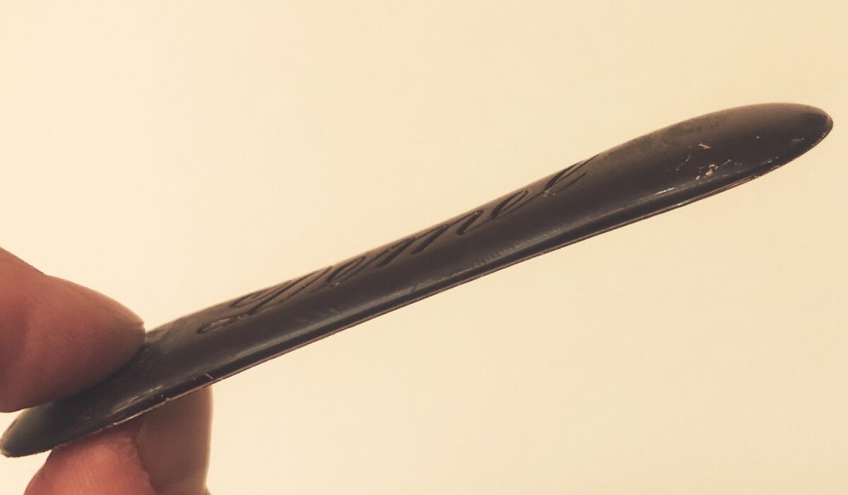 いよいよ実食!チョコレートは確かに、両端に丸みのある個性的な形をしていて、確かに猫の舌のように繊細な形なのですが、さすがに表面はツルっとしていて、滑らかな食感のチョコレートです。長さは8㎝ほど。
