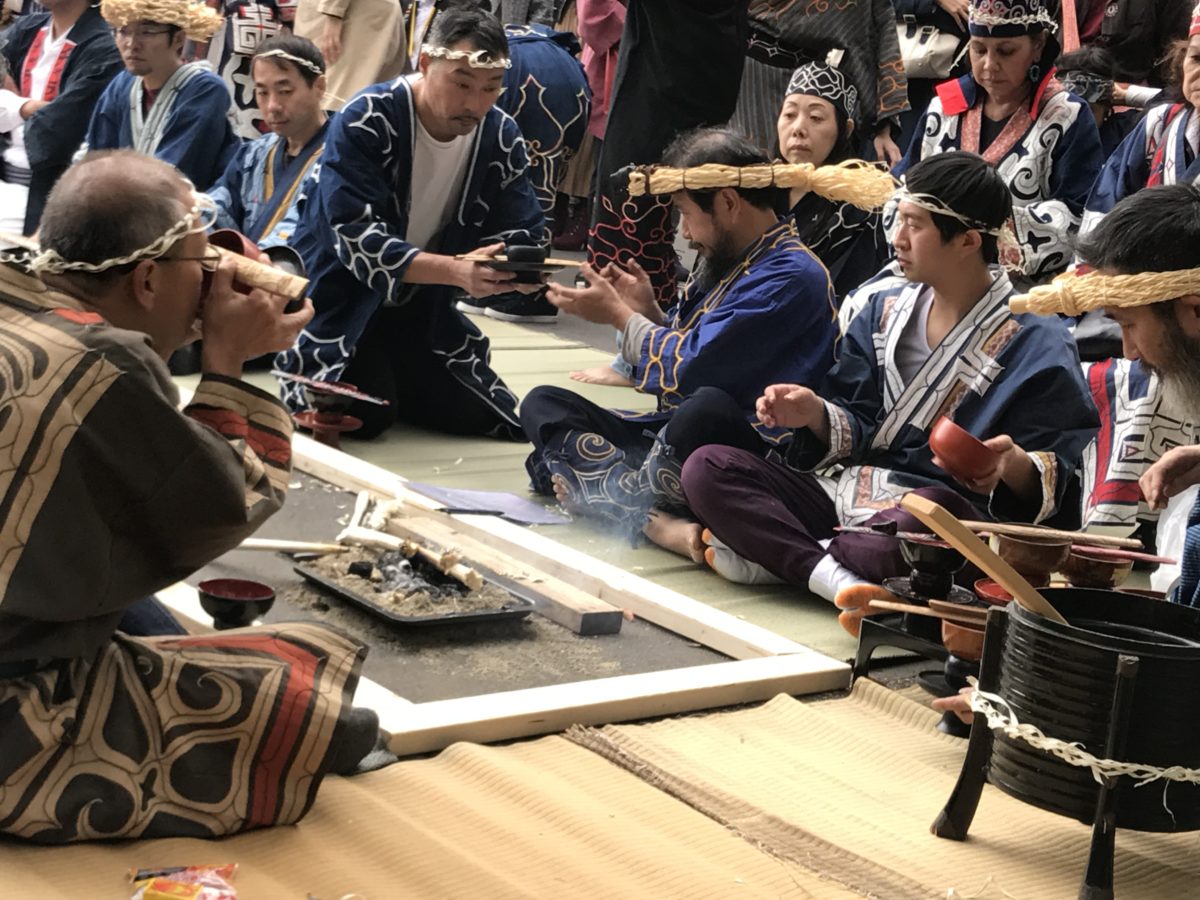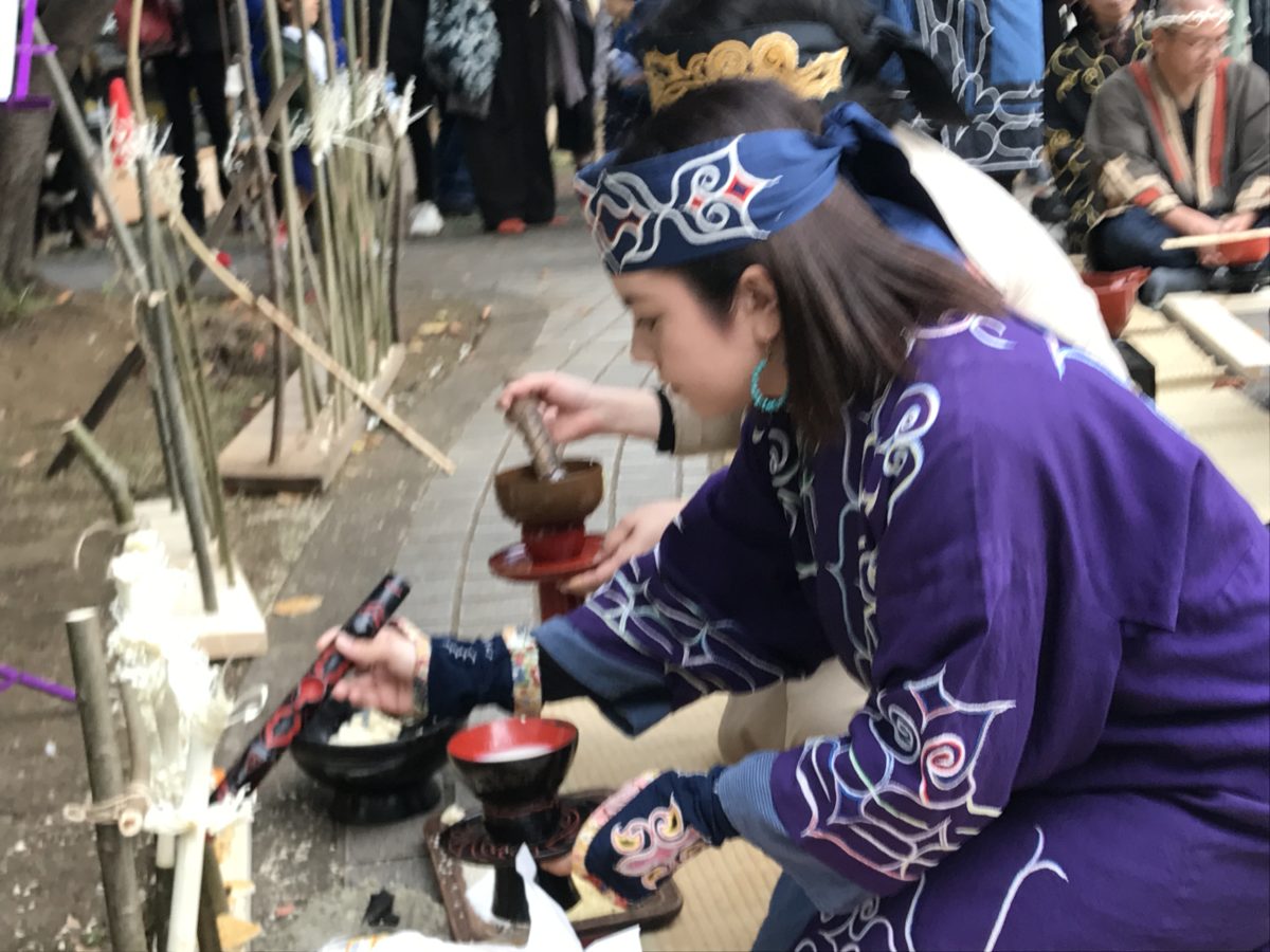 まず初日めはアイヌ民族の「カムイノミ」が行われます。「アイヌ」とはアイヌ語で「人間」という意味。「カムイ」は人間生活にかかわりのある動植物や自然現象など、人の手に及ばない物を指し、すべて魂のあるものと考えられています。カムイノミでは「イナウ」と呼ばれる柳の木でできた祭具や、酒や食べ物を捧げ、カムイの恵みに感謝を示します。