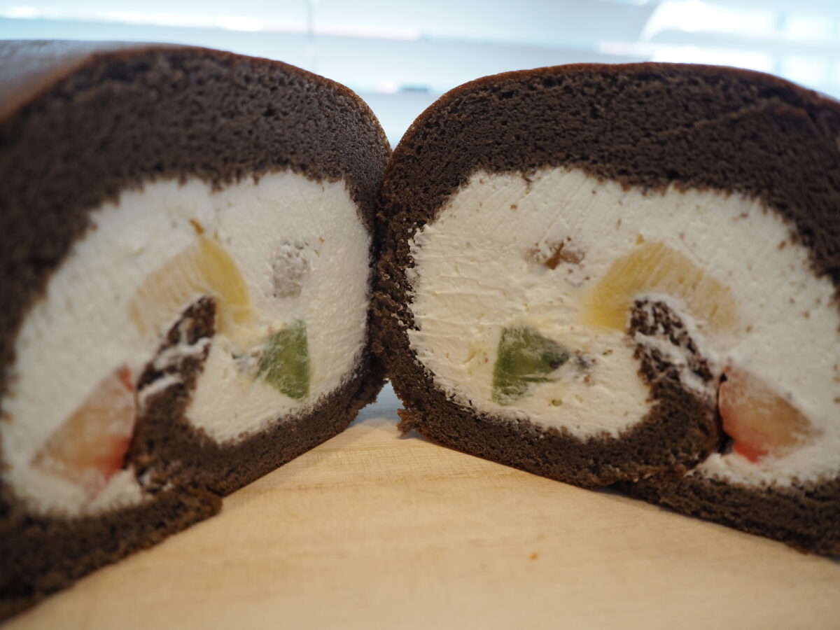 節分 恵方巻ロールは、ふわふわのココアスポンジの中にフルーツとカスタードクリーム、生クリームがぎっしり!