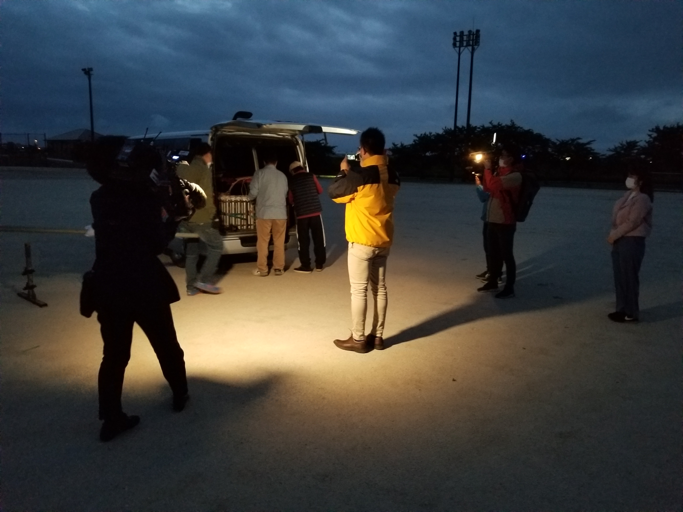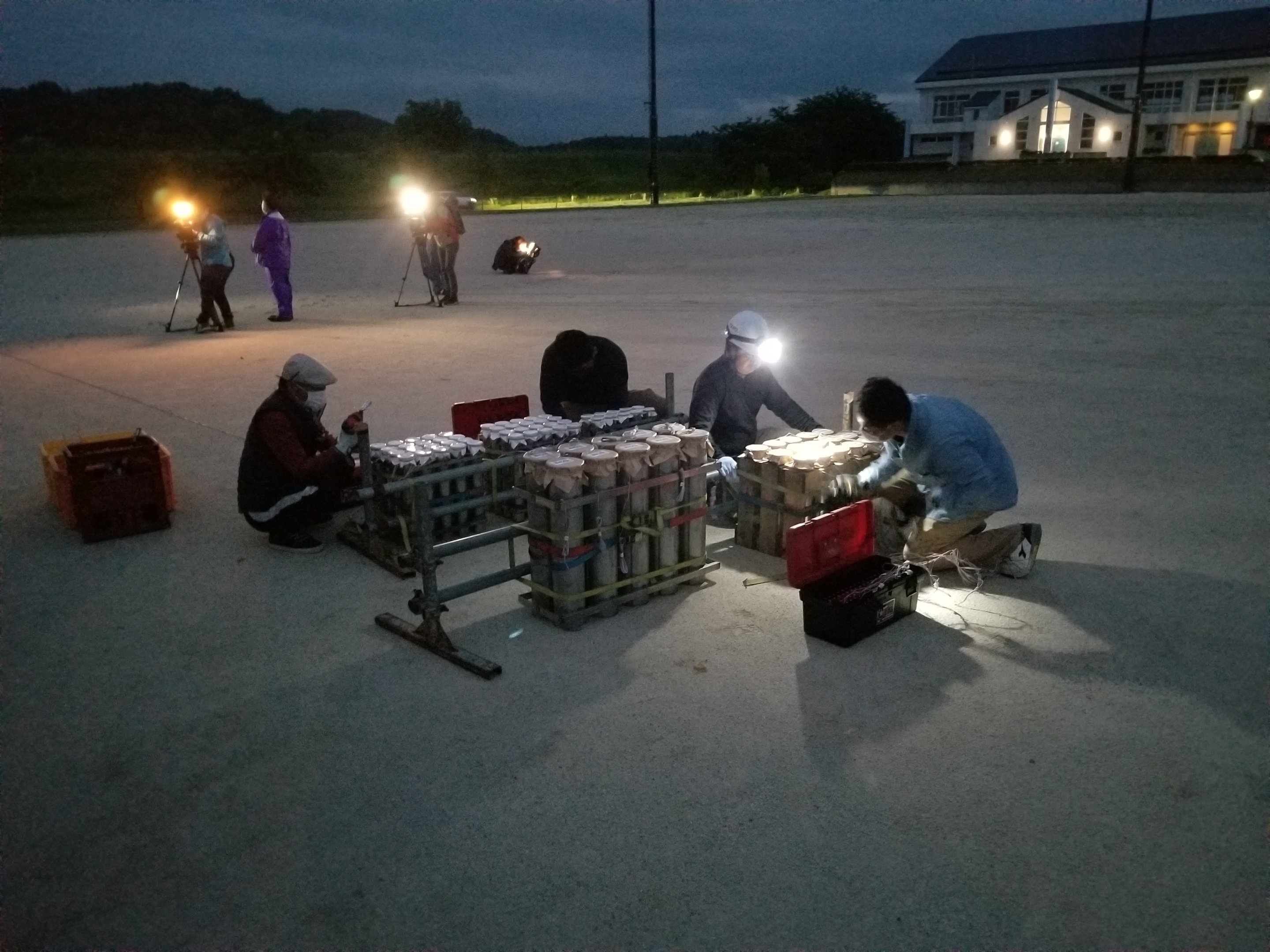 午前中に降っていた雨もおさまり、花火を打ち上げるには良い条件が整いました。新聞社やテレビ局のみなさんも現地に到着しましたが、いつもとは違って非公開の花火大会なので大声をあげたり、機材を大掛かりに準備する事は避けて貰ったりと色々と気を使っていた様です。