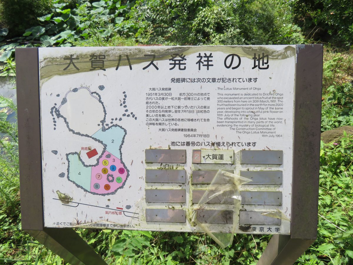 落合遺跡は縄文時代の集落ではないかと推定されています。1981年には丸木舟や櫂に混じってハスの種子が出土しました。ハスの種子を植えると、古代からの長い眠りを覚まし元気に花を咲かせたのです。当時ここでハスの研究を行っていた大賀一郎博士に因んだ命名がなされました。今では「検見川の大賀ハス」として千葉県の天然記念物に指定されています。緑地植物実験所に沿って走る道は、大賀ハス通りと呼ばれています。「大賀ハスのふるさとの会」という組織も活動を行っています。