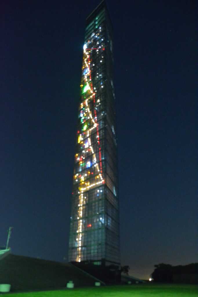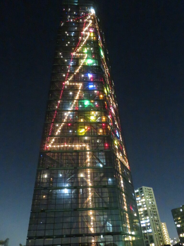 千葉県の人口が500万人を突破したことを記念して建設された千葉ポートタワーの外壁には、例年クリスマスシーズンにジャンボツリーが描き出されます。高さ約100メートル、幅約30メートルの規模は国内で最大で、ギネスブック1989「日本の記録」に掲載されています。