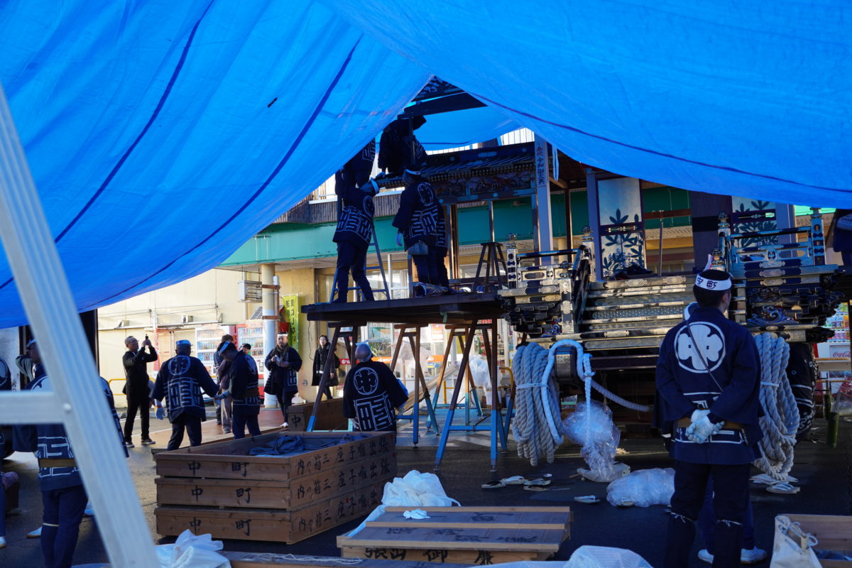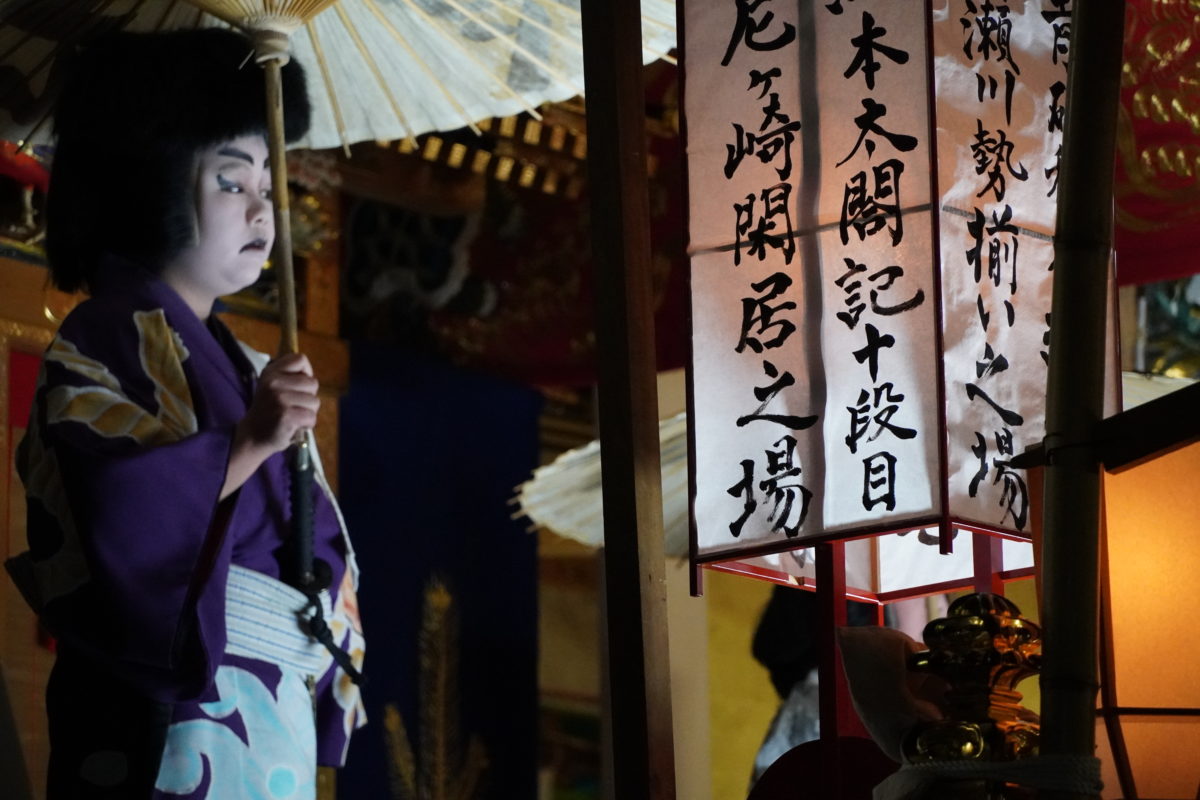 屋台で行われる演舞としてもう一つ見逃せないのが、屋台芝居!当番となった町会の屋台を曳行の合間で増築し、‟張出舞台”を設置。その舞台上で行われる芝居です。因みに2019年は「中町」が当番でした。