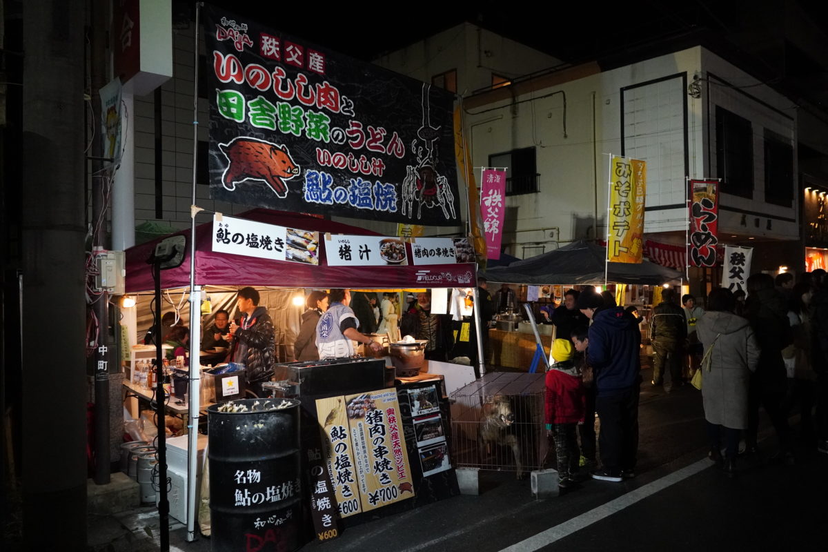 秩父夜祭は、山車じゃない方の屋台も充実しています!秩父の名産品を活かした秩父ならではのグルメの他、お祭りでは定番の屋台も充実!1日目の宵宮でも十分な数の屋台が出店していますが、2日目の大祭では更に数が増えてにぎわいます!