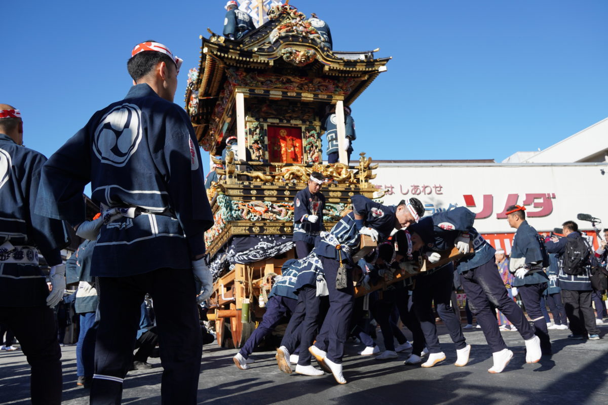ダイナミックな屋台の曳き回し!「ホーリャイ!」「ホーリャーイ!」の掛け声が威勢を感じさせますね。中でもハラハラするのは、屋台がすれ違う瞬間。道幅いっぱい使ってもギリギリなので、ぶつかりそうでハラハラします。