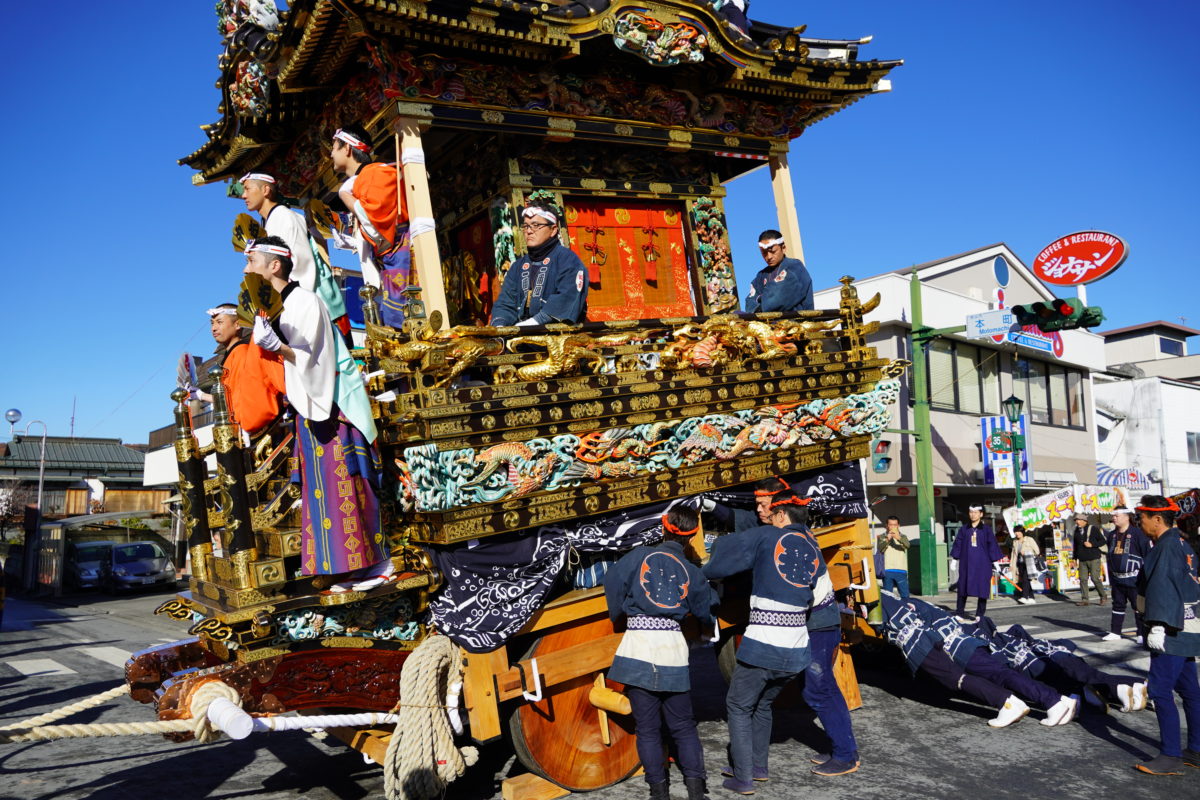 秩父囃子は曳き回しが行われている間中、屋台の中で演奏されていますので、お囃子の音色も楽しんでください!特に、屋台の方向転換(ぎり回し)をするタイミングは、お囃子の音色が変わりますので、音色を聞き分けるのも楽しいですね♪