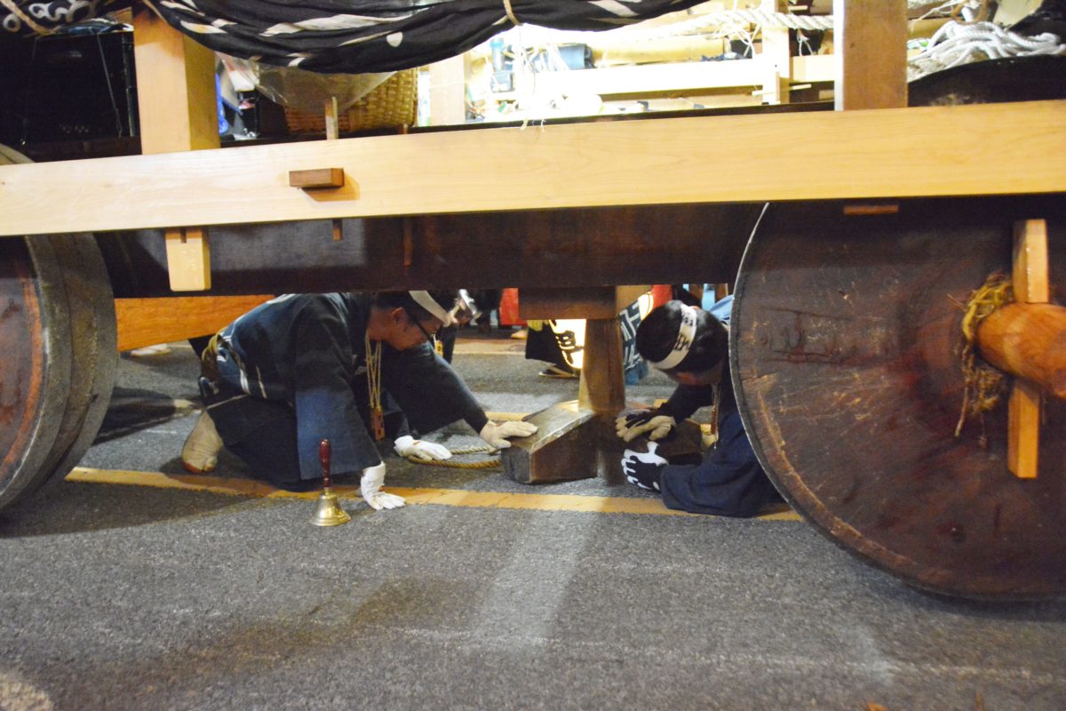 山車と一緒に通りを歩くと、交差点などでユニークな光景を見かけることがあります。「ギリ廻し」と呼ばれる特殊な方法で方向を変えるのです。山車の下に台をセットし、これを支点として2本のてこ棒を使えば少ない人数でも方向転換することができます。