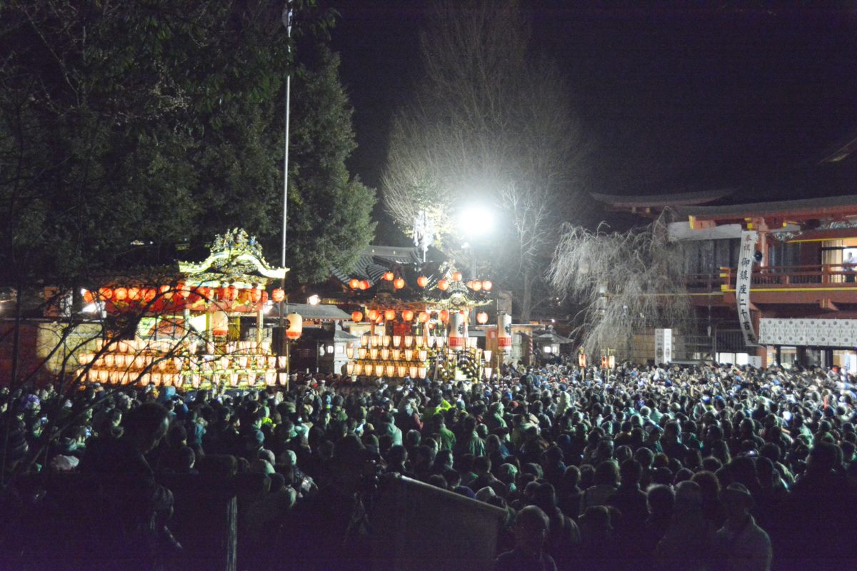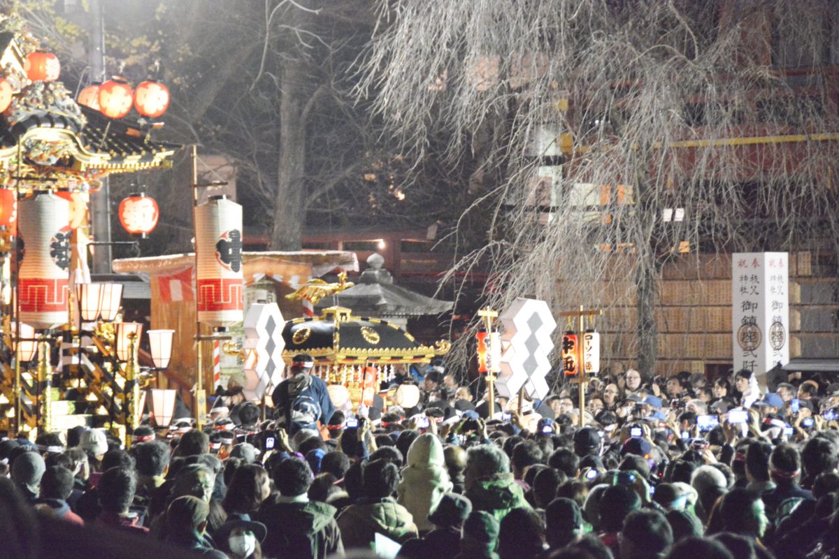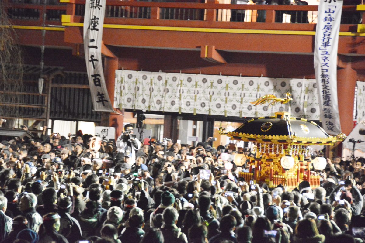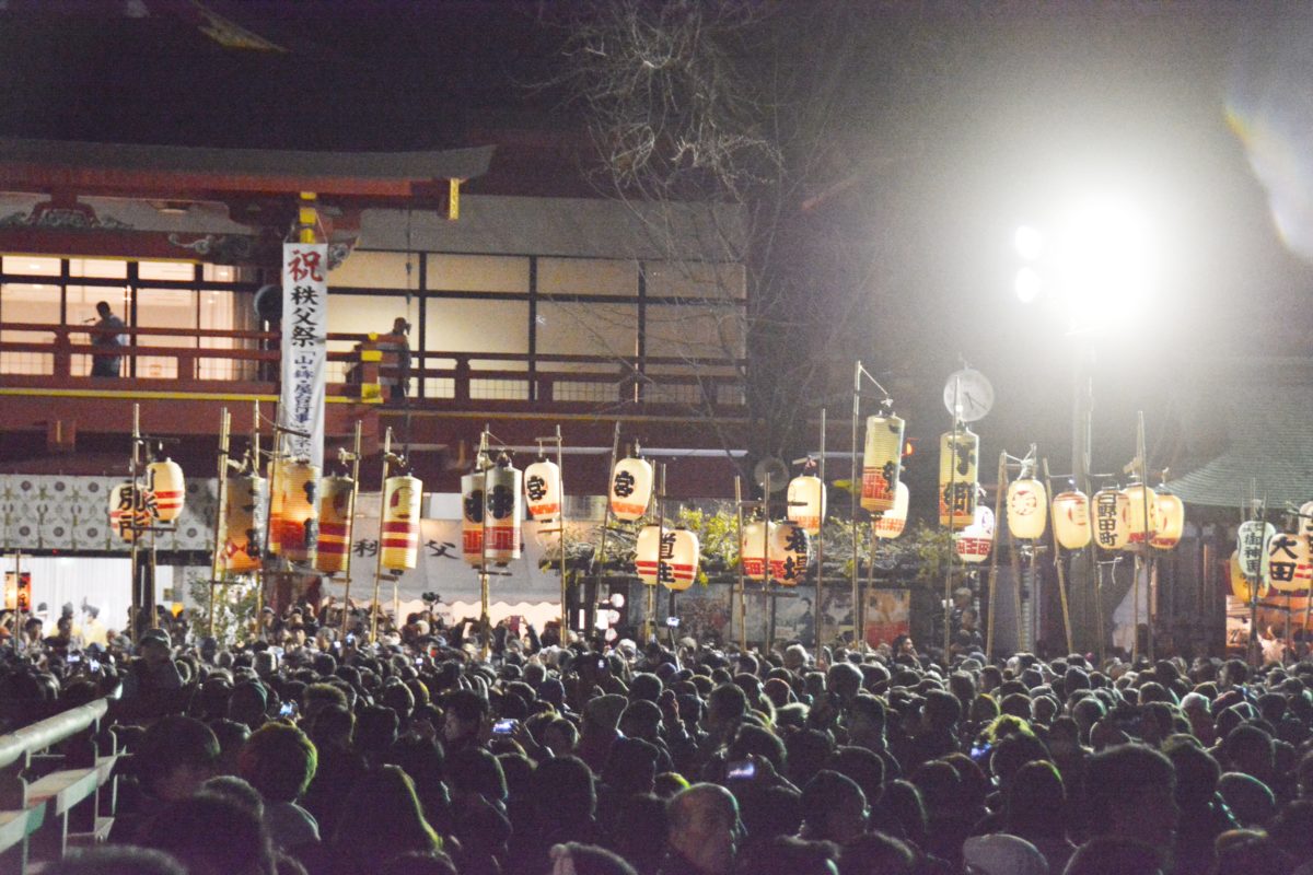 様々なイベントで気分を盛り上げ、クライマックスの時を迎えます。太陽が西に沈む頃には、秩父神社の境内からは熱気が溢れ出すばかりでなく、敷地に入れない人が逆流してきます。
