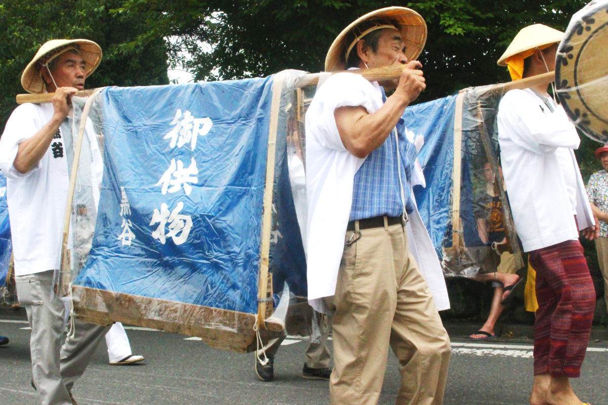 続いて御供物を担いだ各町の皆さんがやってきました!この中にはお餅が入っていて、神輿洗いが終わった後にお供えされます。