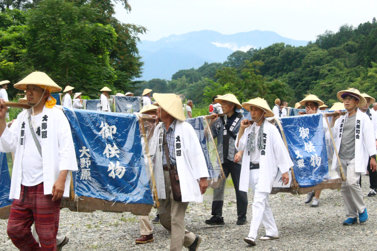 お神輿が霧立ち込める荒川の下流から登場しました!実はお神輿は途中でルートを変えて下流から荒川へと入り、上流の川瀬斎場(お神輿の上陸場所)を目指して進んできていました。